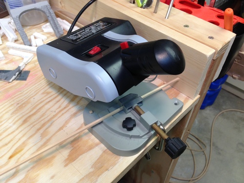 With the completion of the two side walls and the back it was time to add the interior framing. After buying the strip wood for this part of the project I decided that I need a better way of cutting it than my chopper.  I purchased this miter saw from Micro-Mark and so far it has worked out real well. Nice clean square cuts and the angle setup is very accurate and easy.