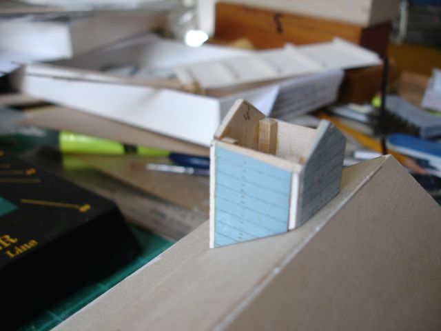 The other task I managed to complete was the little roof structure. I cut the corners pieces to fit, glued it all together and gave it a quick painting. I am not sure what function it serves (like ventilation, hoisting, etc.) and am not sure if I will add it to the roof or not.