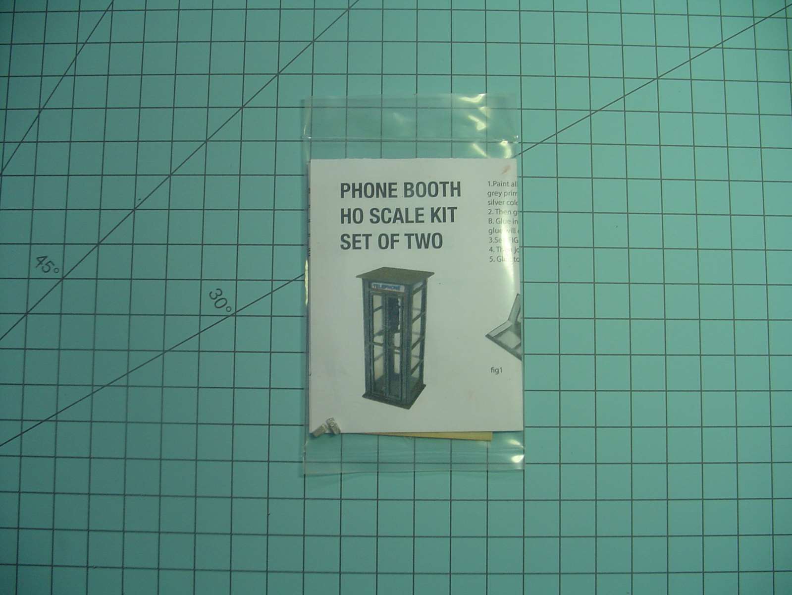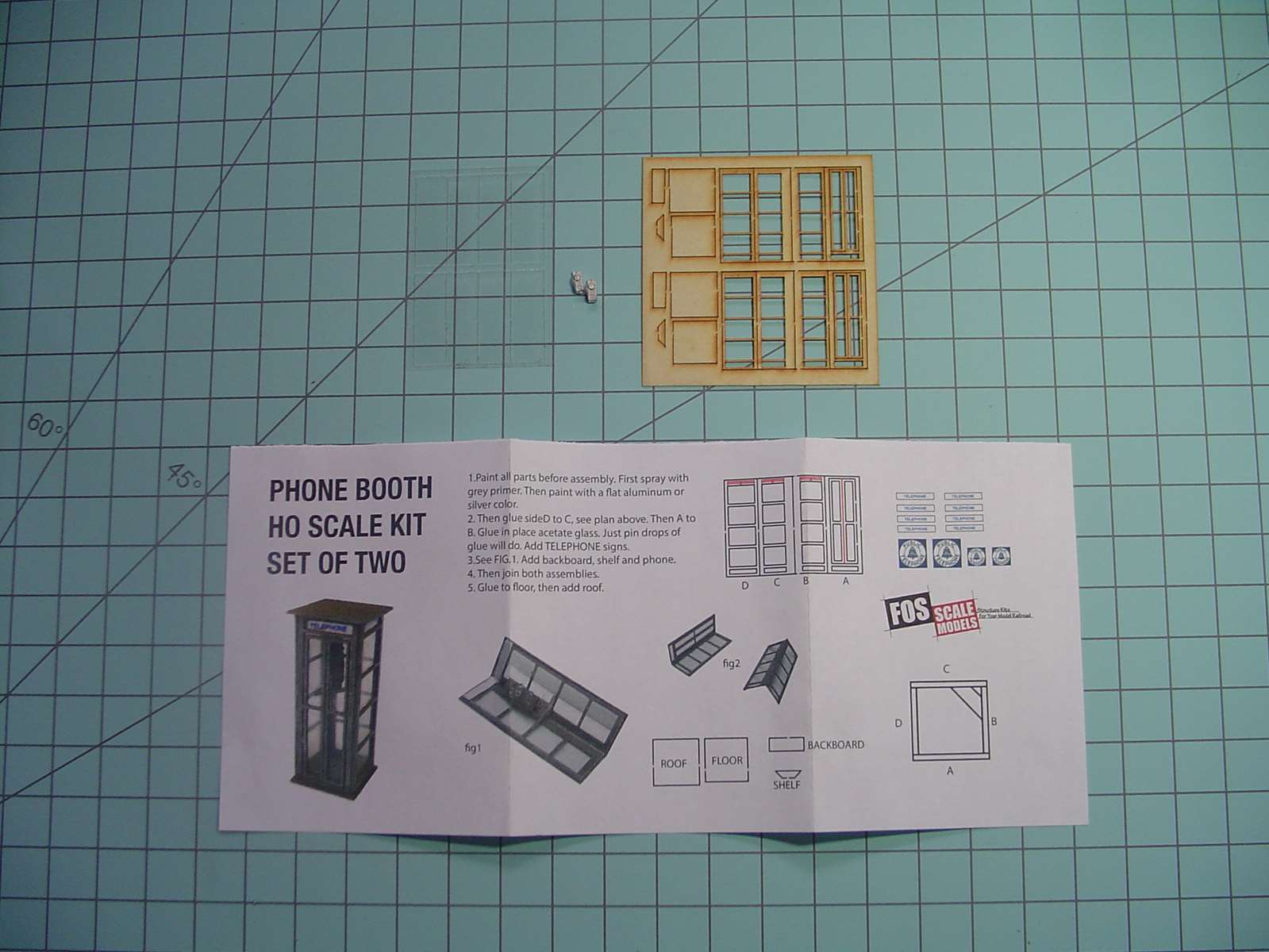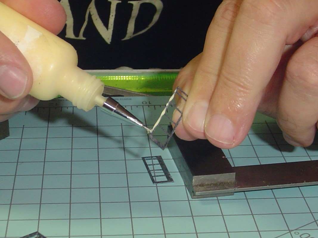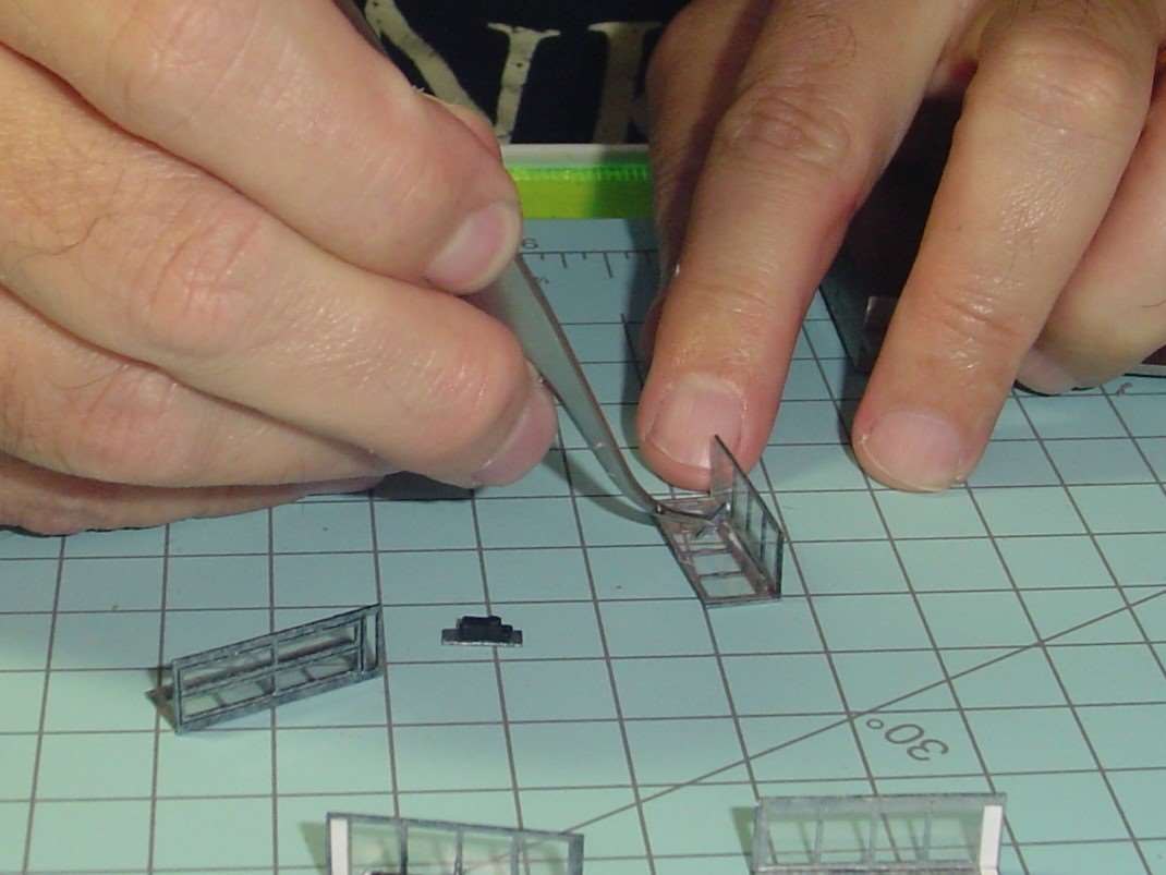 You make two halves of the phone booth that way and when glue had set you can then glue the glass in place.  I used a very sparing amount of MicroScale Industries Micro Kristal Klear for glue.  If I screw up and use too much or get a smudge on the glass (acetate) where I don't it I remove the glass (acetate) and scrub it with q tip dipped in isopropyl rubbing alcohol to clean it off and start over again.