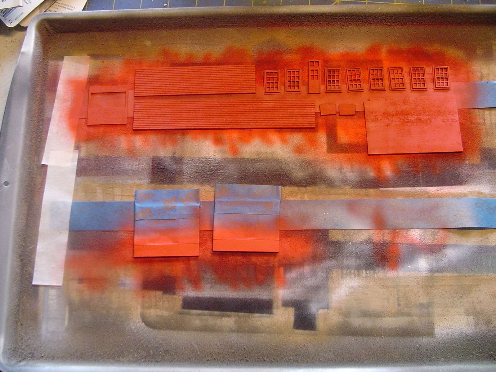 After everything was primed and the paint cured I airbrushed some of the walls and parts Floquil Reefer White.  No photo's of that.  Let's skip ahead to the third airbrush session where I picked out the parts that I was going to airbrush with Floquil Signal Red.  The two walls on the bottom row are a two tone paint scheme.  White on top and Red on the bottom.  So I masked off the top that is going stay white in preparation for painting the bottom red.  Think about it for a second though.  Why red over white rather than white over red?  The latter would work but it's much harder to cover red with white than it is white with red.