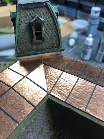 First I found at Hobby Lobby thin 12 x 12 copper foil on a backing used in the Cameo printers in the craft paper area. I had the printer cut out the needed shapes. I then put the 3M 465 tape on each cardboard roof piece. The copper foil was then carefully attached to the roof. You could do this just as easy by rough cutting the foil to the roof shape and trimming away excess after foil had been attached to roof using the tape. A printer is not needed. I had already painted the roof battens Ceramcoat Charcoal Gray so I simply glued them in place using Canopy glue. The foil is so thin that the scribe lines can be seen as creases in the foil.