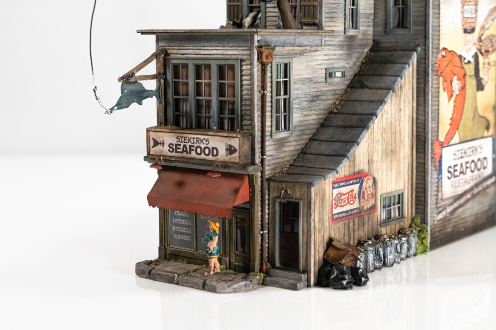 • Added detail castings. Some 3D printed (like the pipes, downspout, trash bags), some were from Rusty Rail (trash cans, water tank), some were from the FOS kit itself (chimneys), some were from FSM kits (the sailfish, the pigeons) and some were scratch-built (the fishing rod).