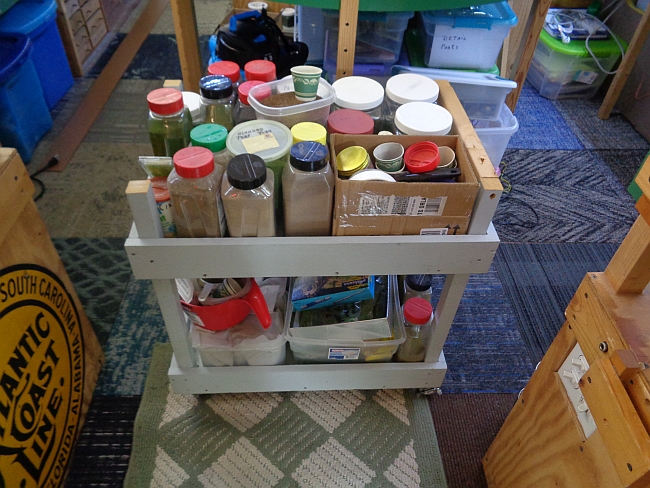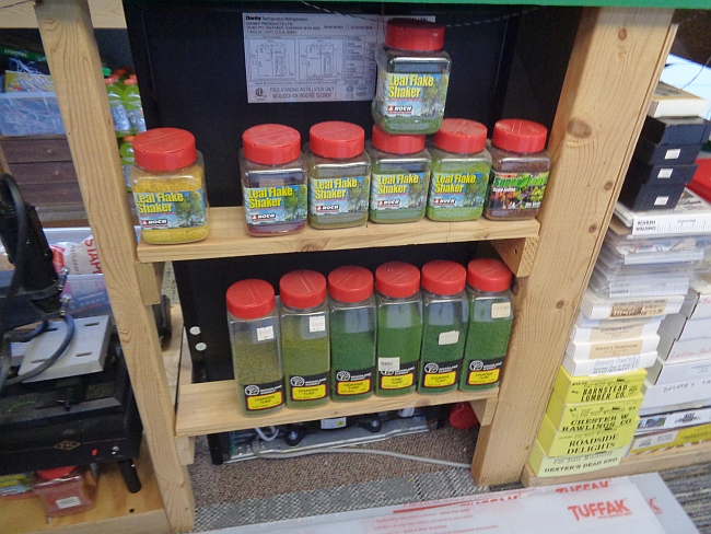 As you can see, my scenery cart is full so I made shelves and stored some material behind my little train shed ice box.
