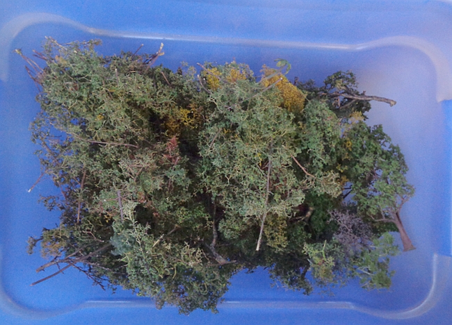 When trees get broken, I don't throw them away. I do throw them in a plastic container. I use these broken tree orphans for shrubbery and bushes. More on this later when the scenery is upgraded.