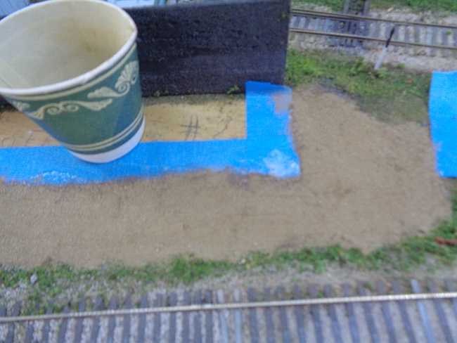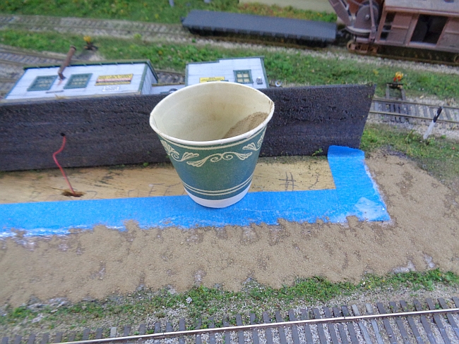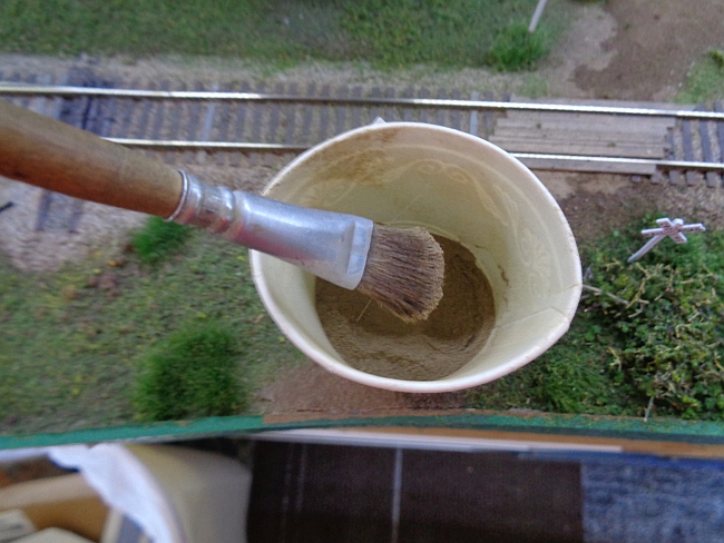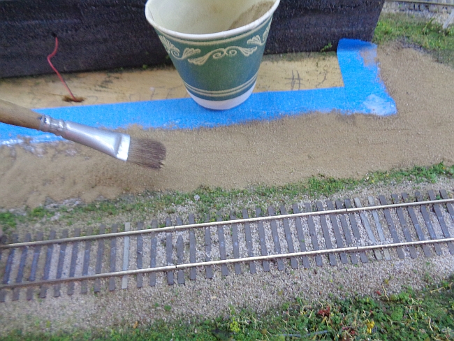 Using a small paper Dixie cup, I sprinkle dirt on the area I want covered and of course over the white glue.