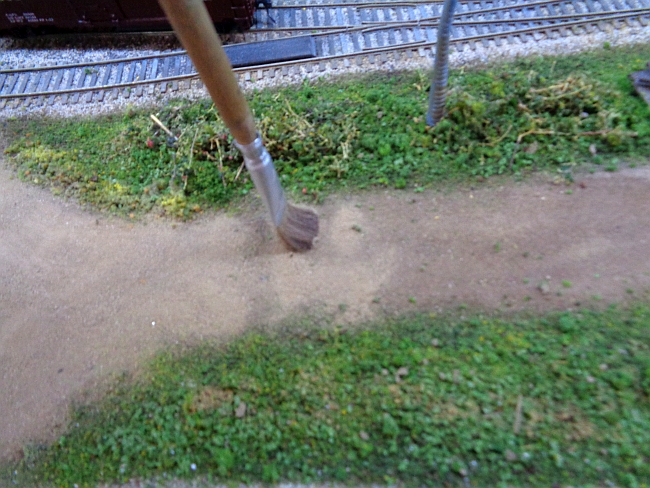 Dip a soft bristle brush in the fine dirt and "paint" the dirt on the road.