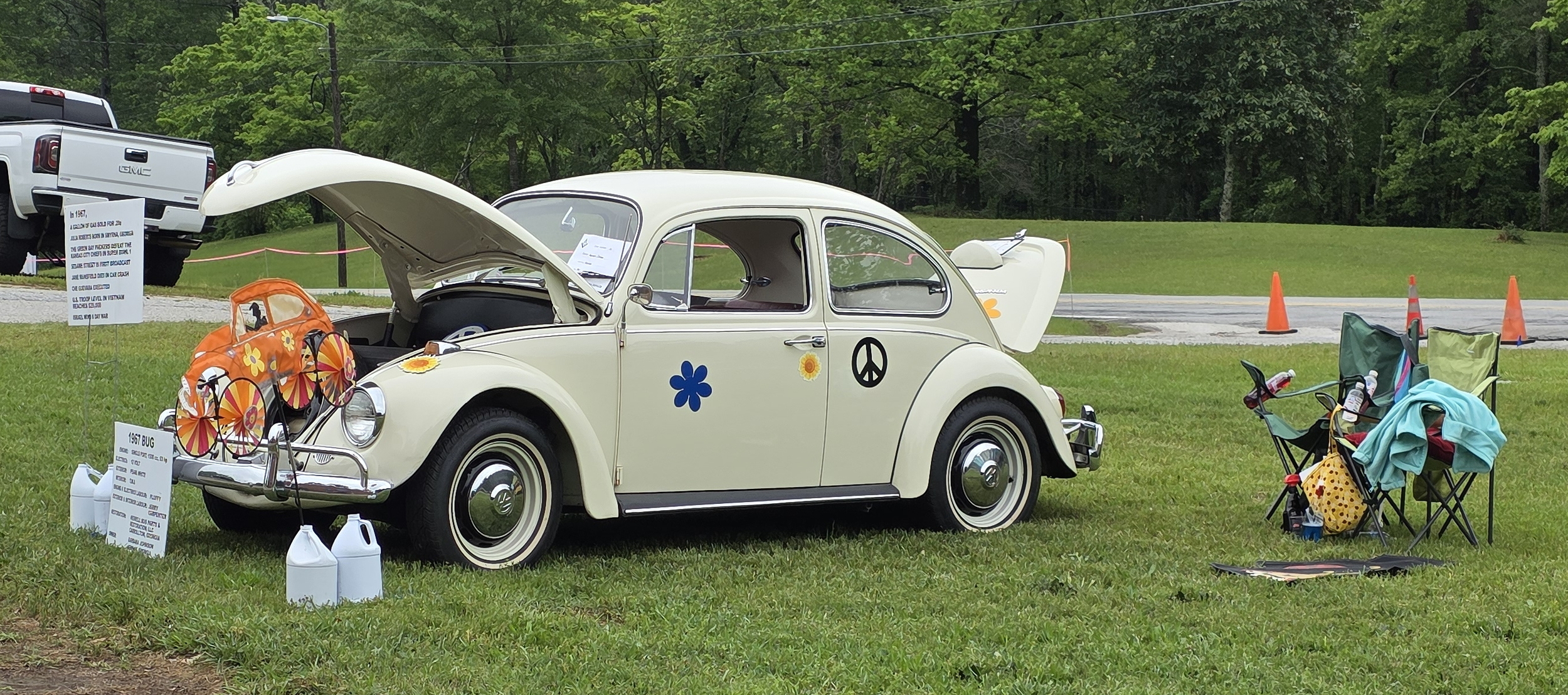 This was an entry in the car show that impressed me the most.  An 86-year-old woman brought the car she bought in 1967 and set up her show site, all by herself.  The beetle looked brand new.