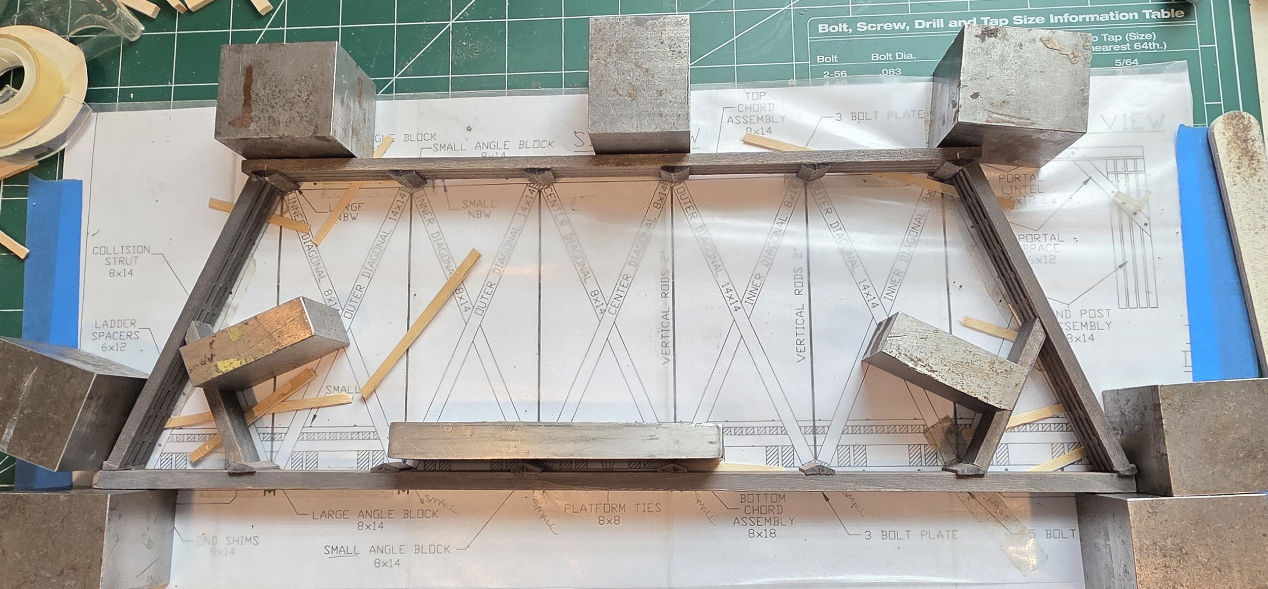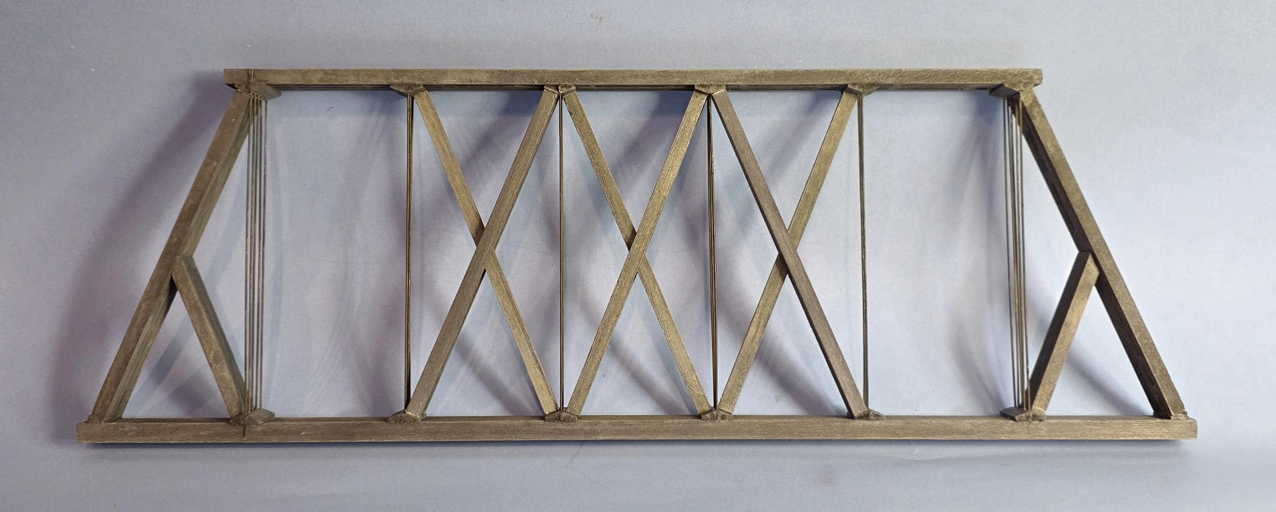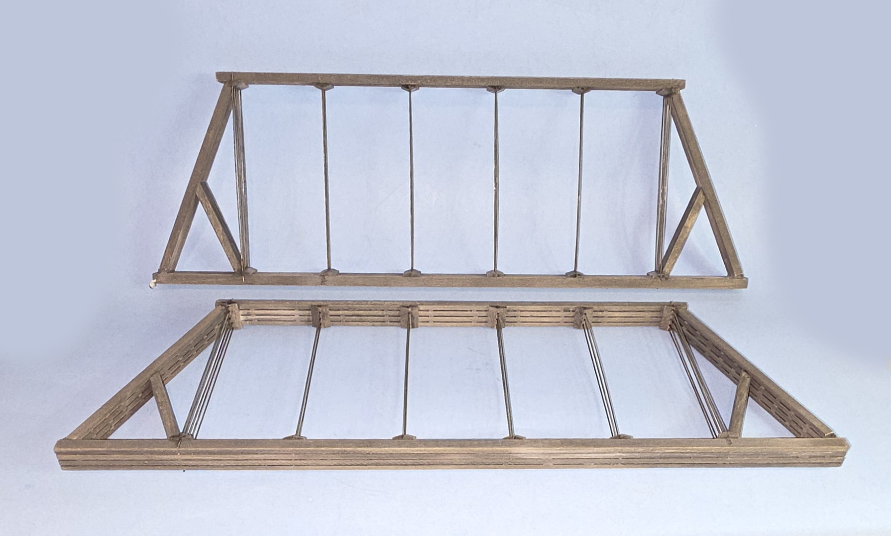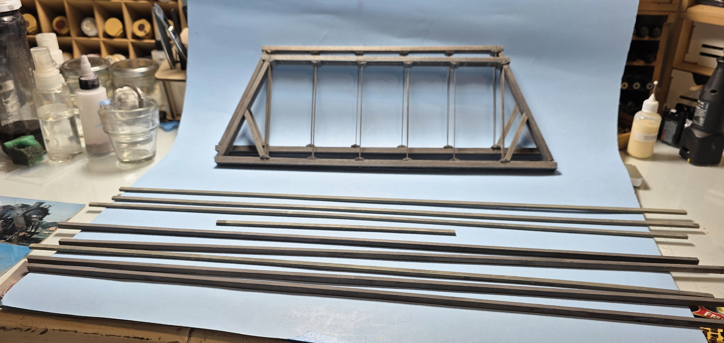 This afternoon, I began adding bracing.  Handy tools were my NWSL wide chopper and True Sander.  Here is the bridge with all the cross bracing stained and ready to cut.