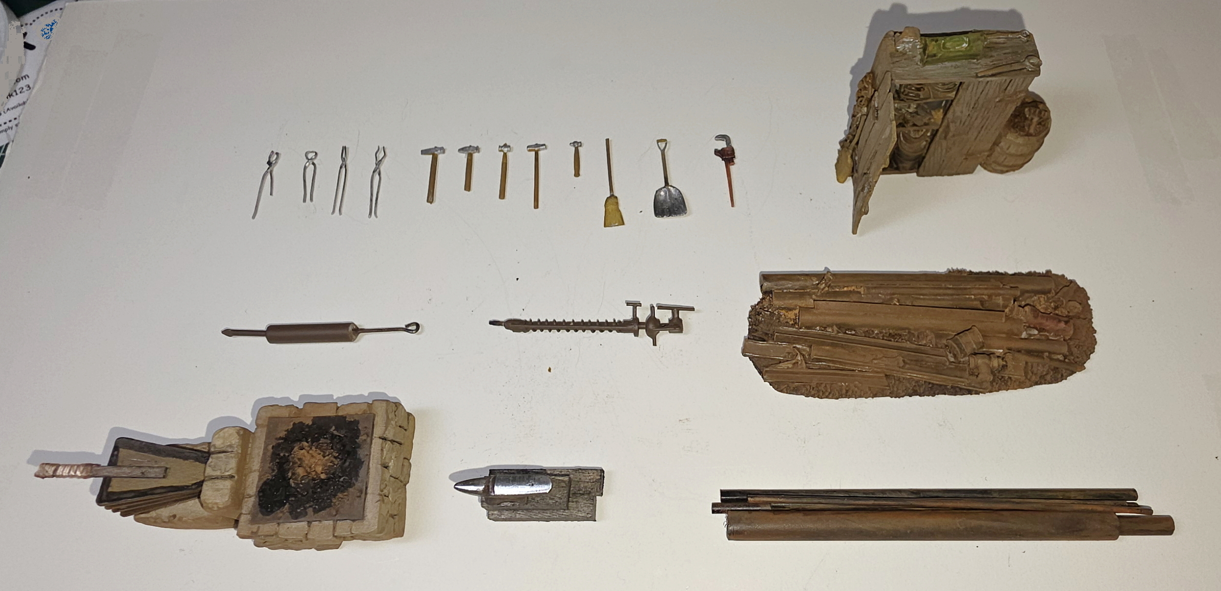 The details depicted include the forge hammers and tongs, a wrench, a shovel, and a broom.  Also pictured are a stack of old drill bits and pipe, the forge, an anvil, a sand pump, a temper screw, and a storage cabinet.