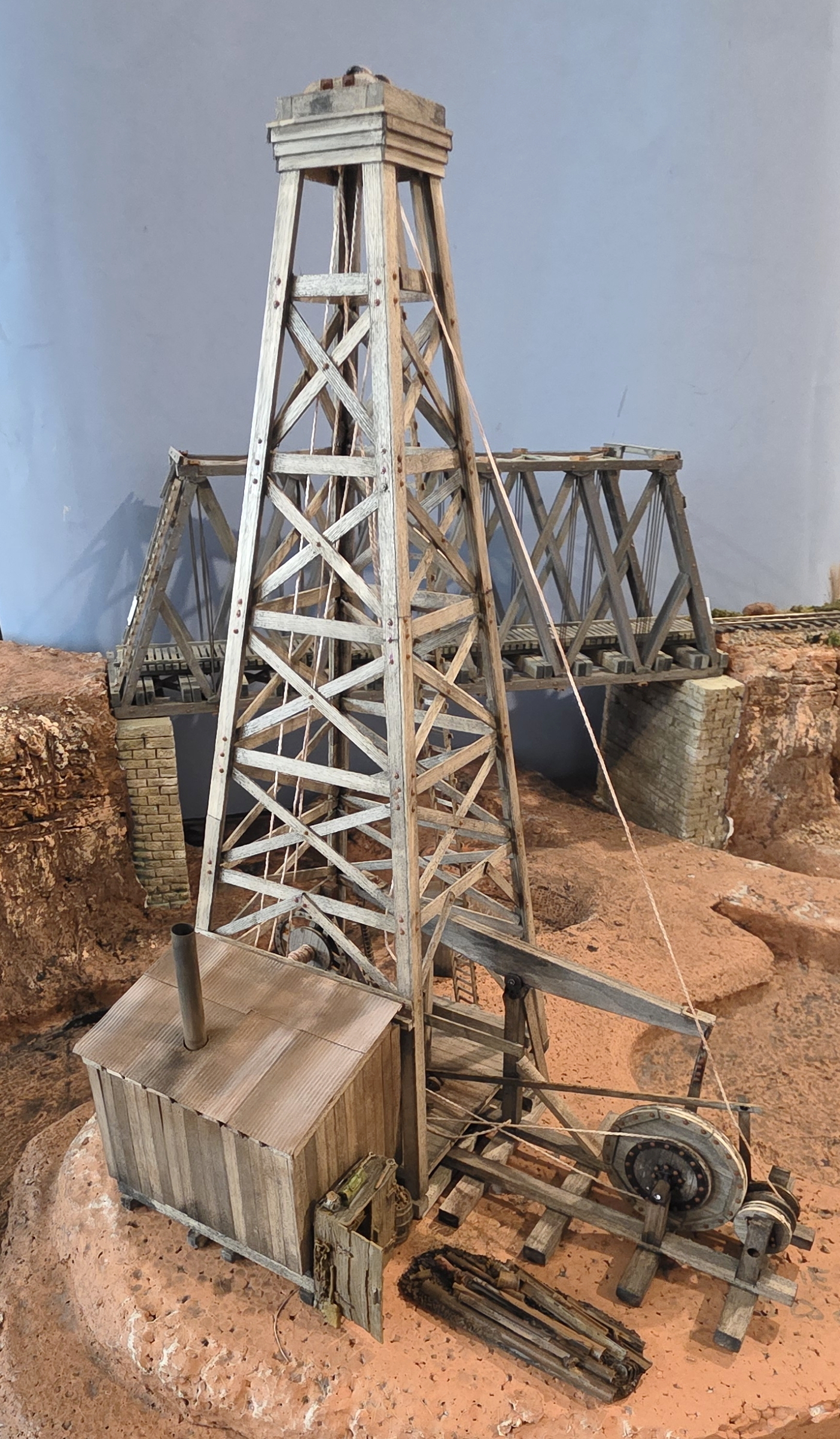 To those just passing through, thanks for taking a moment to watch the oil derrick grow.  A ladder and outhouse are all that remain to be done before it goes on the layout.  An oil tank will follow in a while...