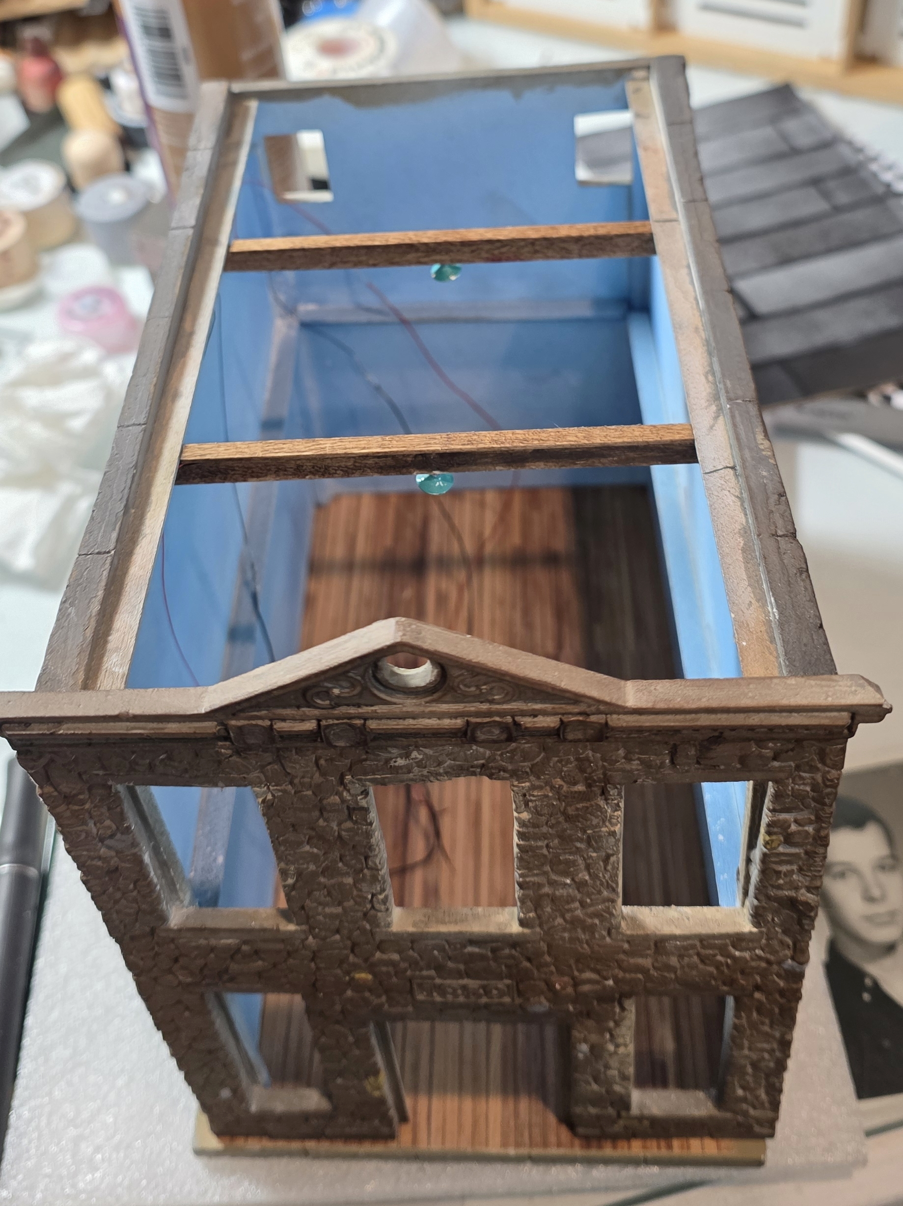 While waiting for the paint to dry, I glued in two rafters that house the lights.  After the glue dries, I'll run the wires and resistors.