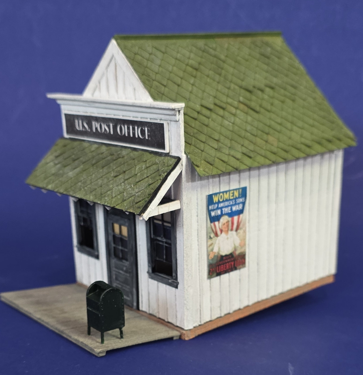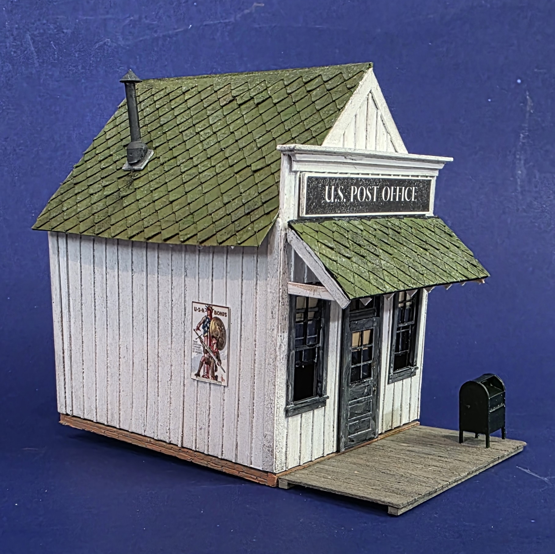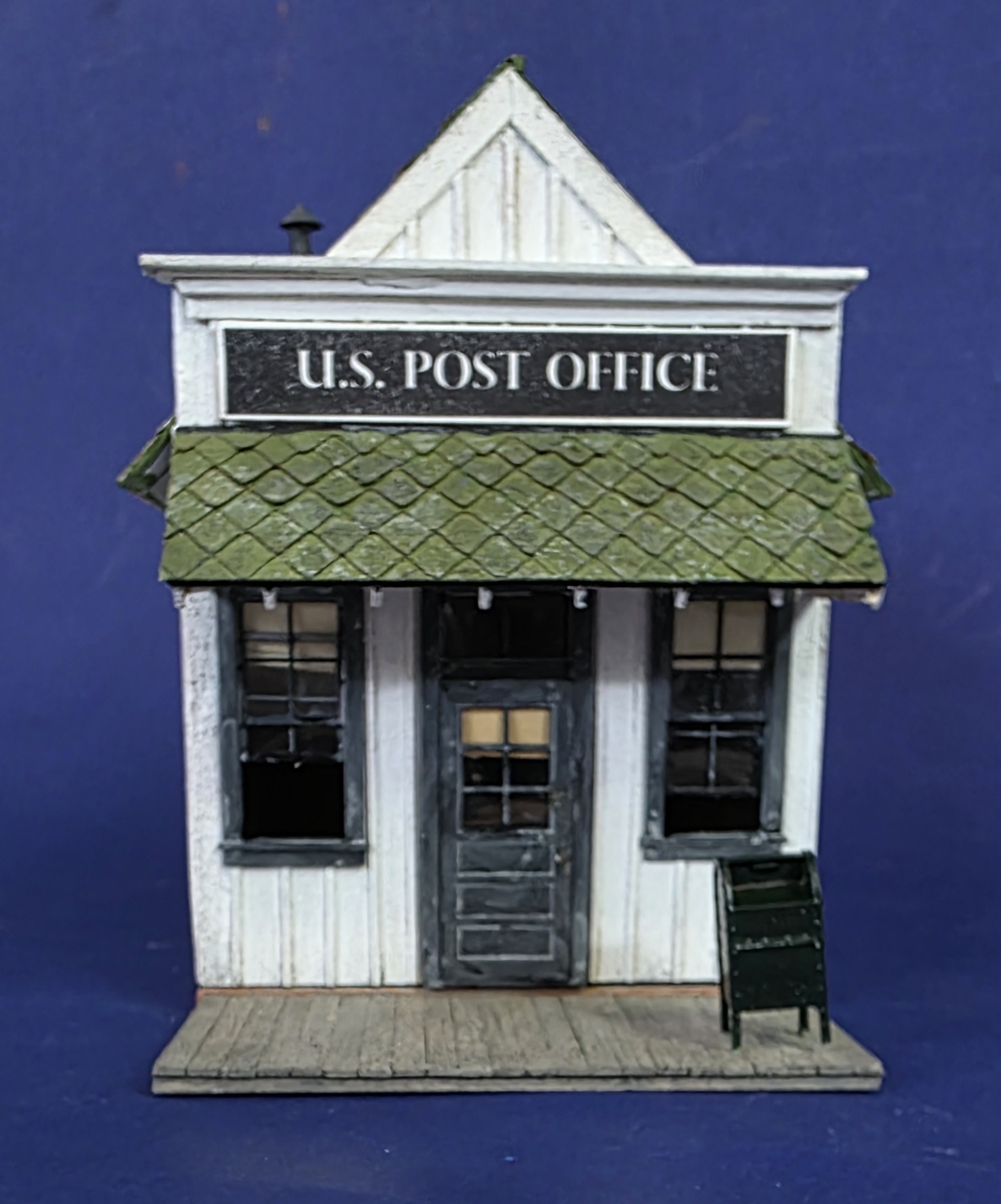 I'm calling it done on the Post Office. Beginning with a napkin diagram, designing, cutting on the laser, and ending with the final assembly of painted parts, it's been a fun build. The most difficult part of the design was getting the windows and door the right sizes.