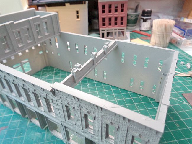 There is a cast resin upper wall with chimneys that is to fit between the two stores. The high wall part goes in front and the shorter one towards the rear.
