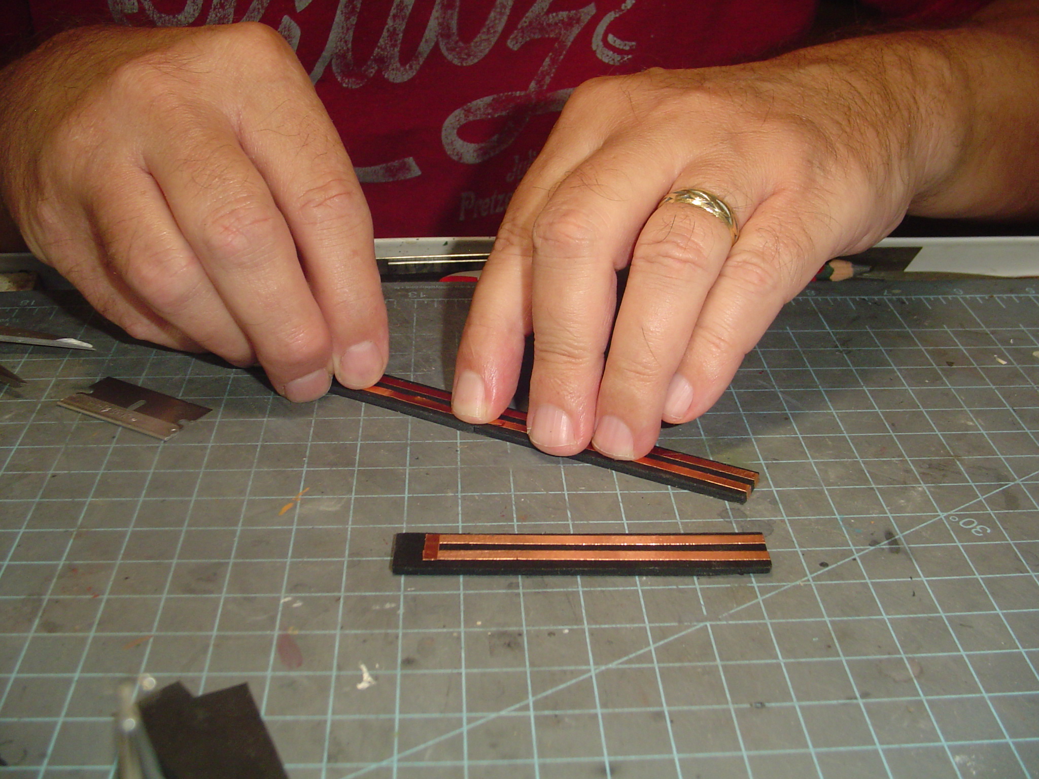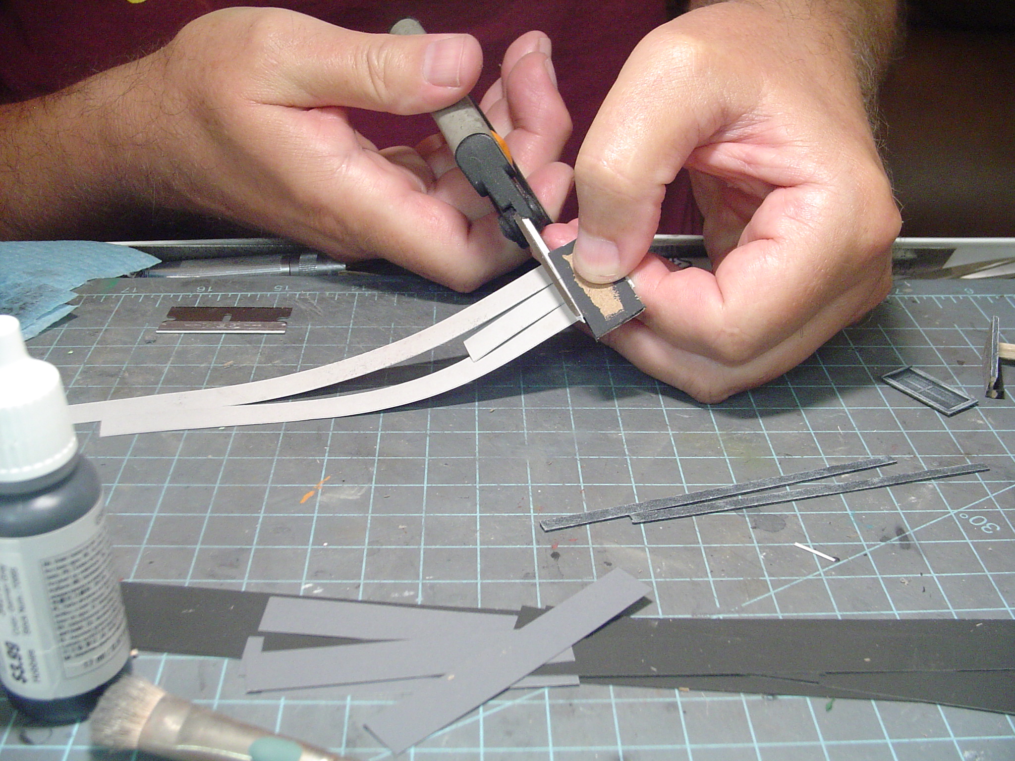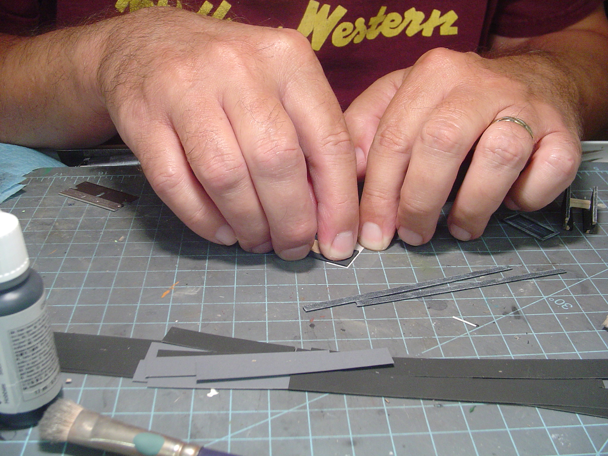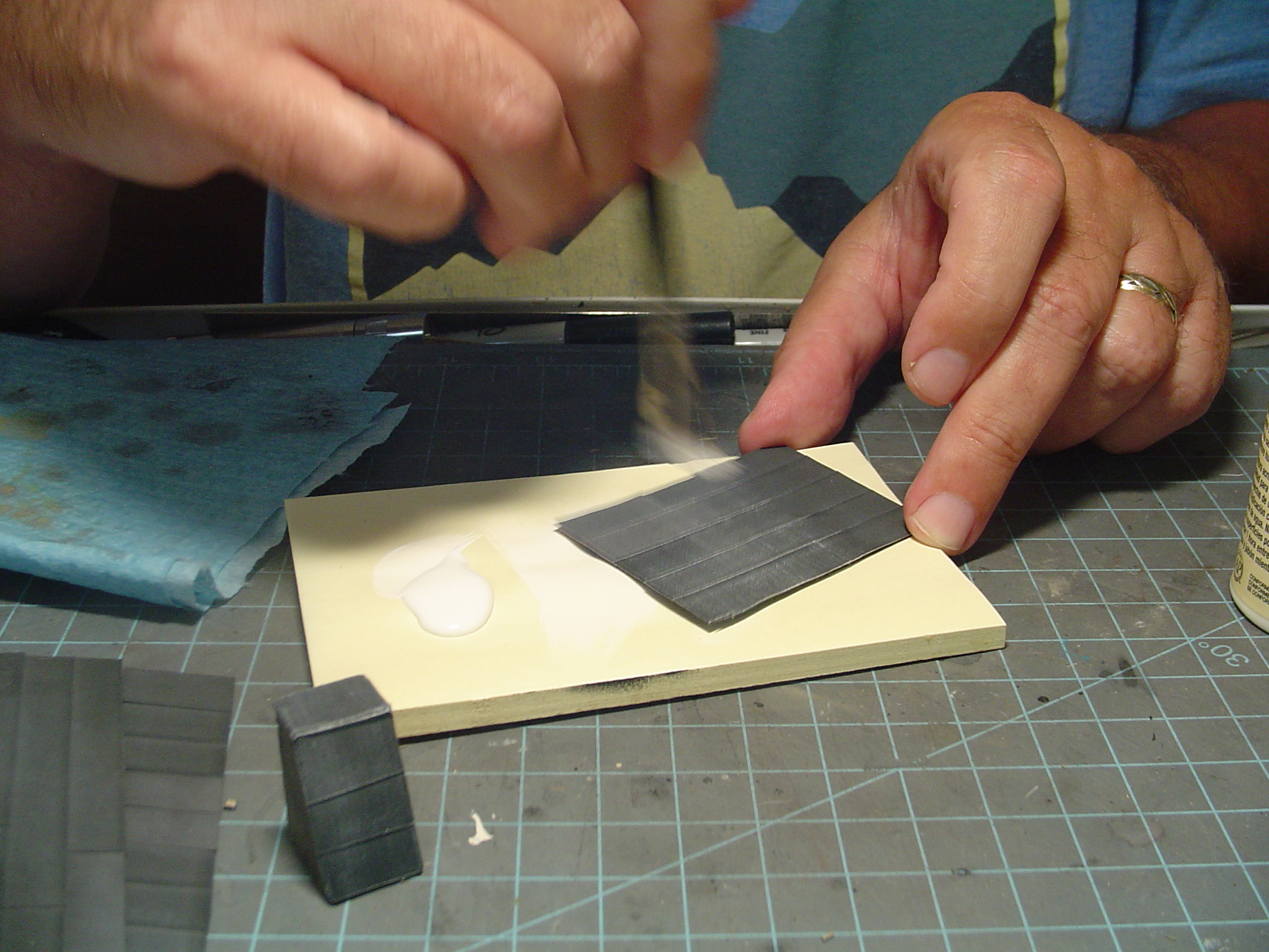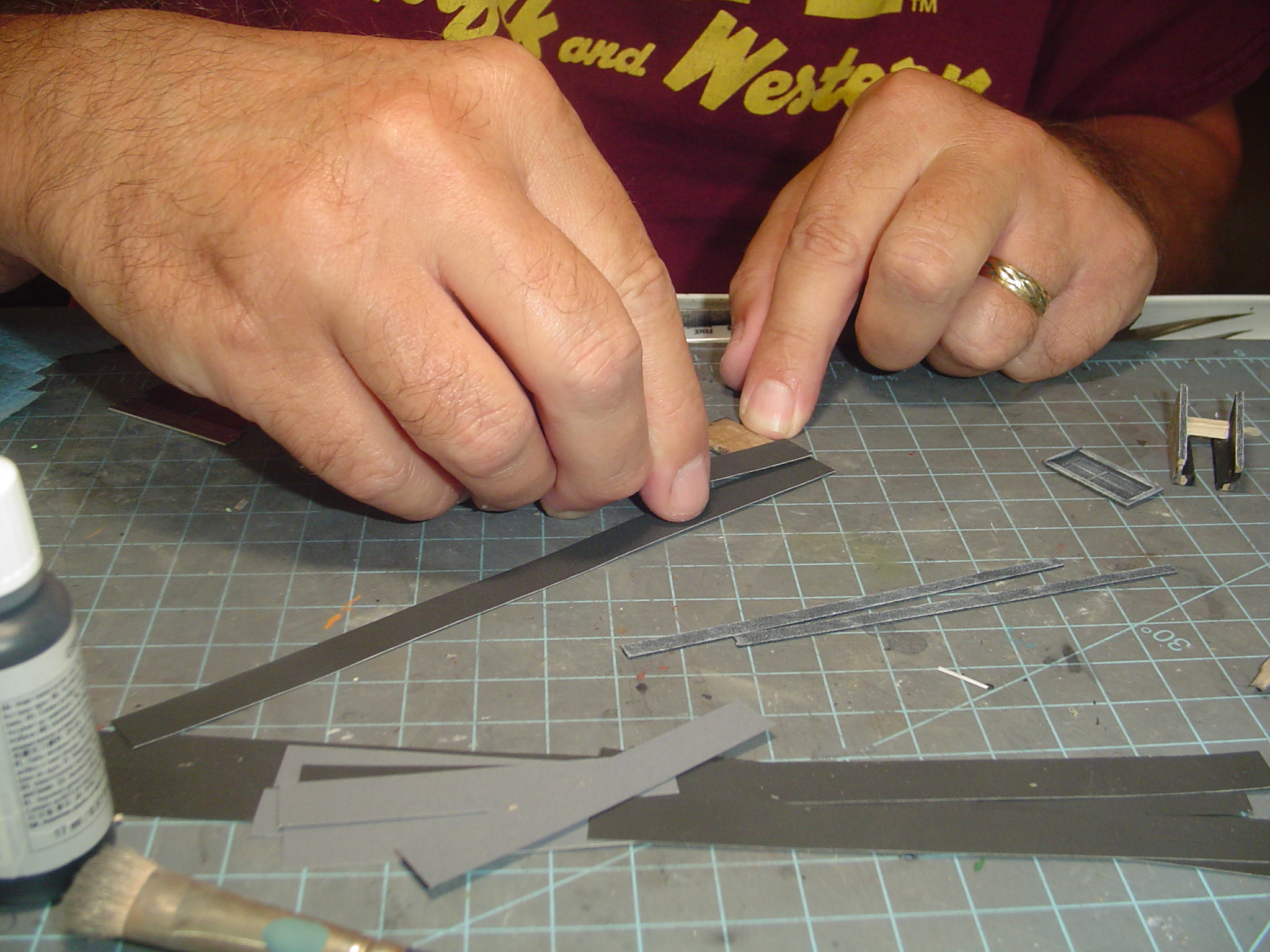 Once I have a few courses of rolled roofing attached to the cardstock I trim the overhang with a pair of scissors (or an X-Acto and steel ruler).