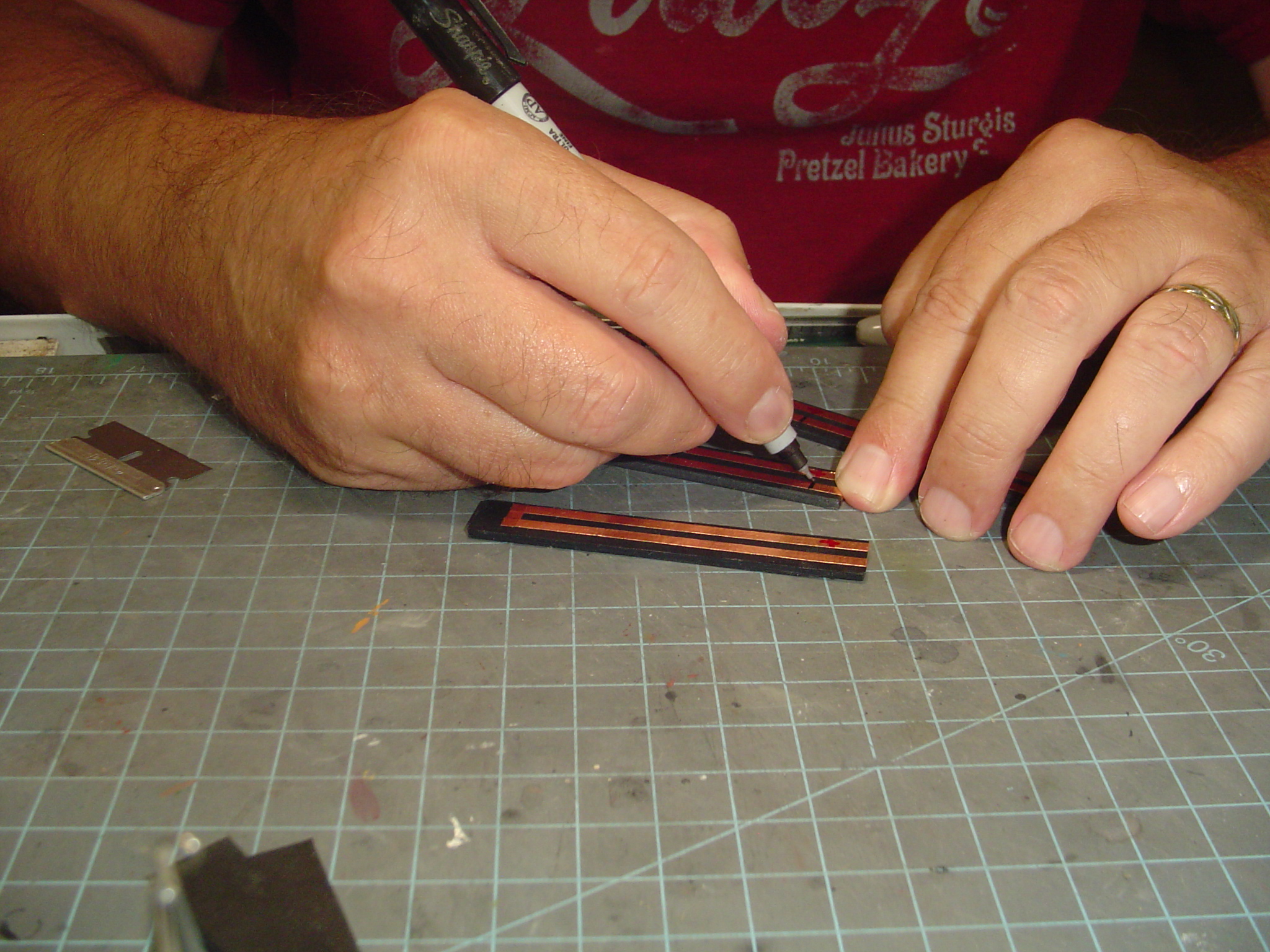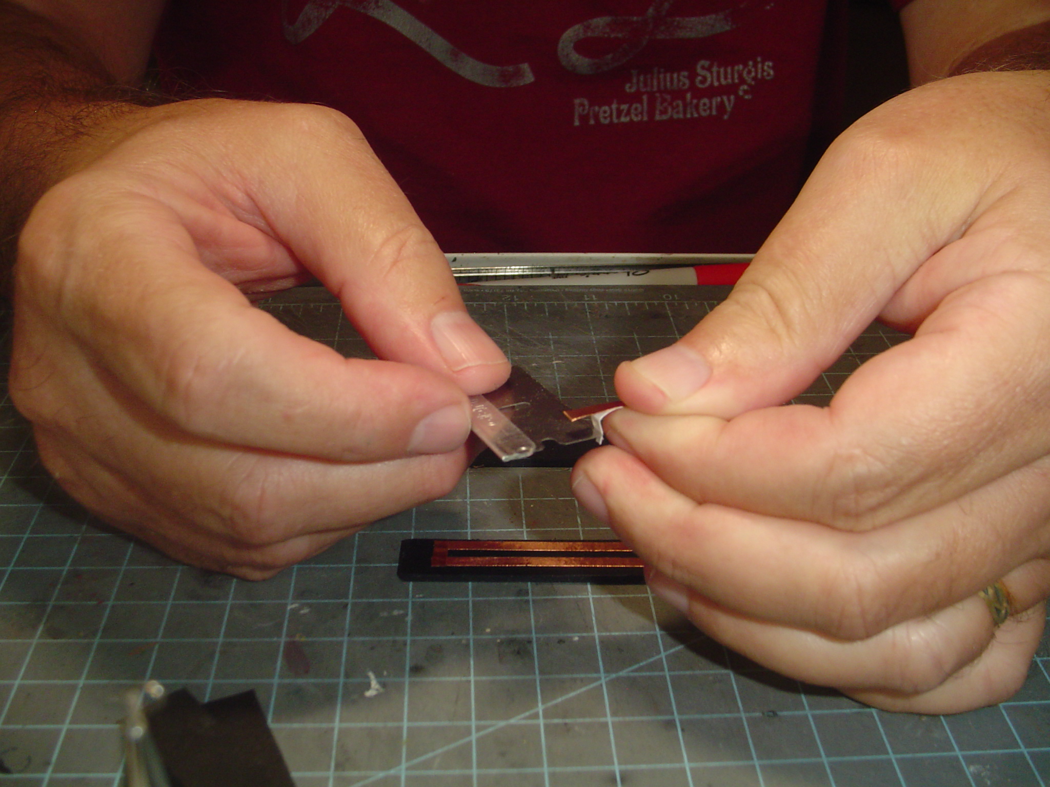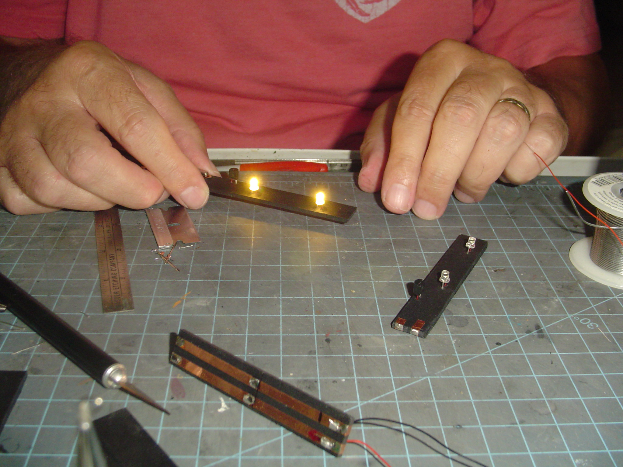 Bob, on that last photo looking through the bottom, you have brass straps running along the walls, and then the light strips running perpendicular to the walls (and parallel to the ground.)  So I think what you did was (1) install a piece with 2 brass strips along the walls, (2) then attach and solder the light strips to these wall-mounted strips.  Is that correct?