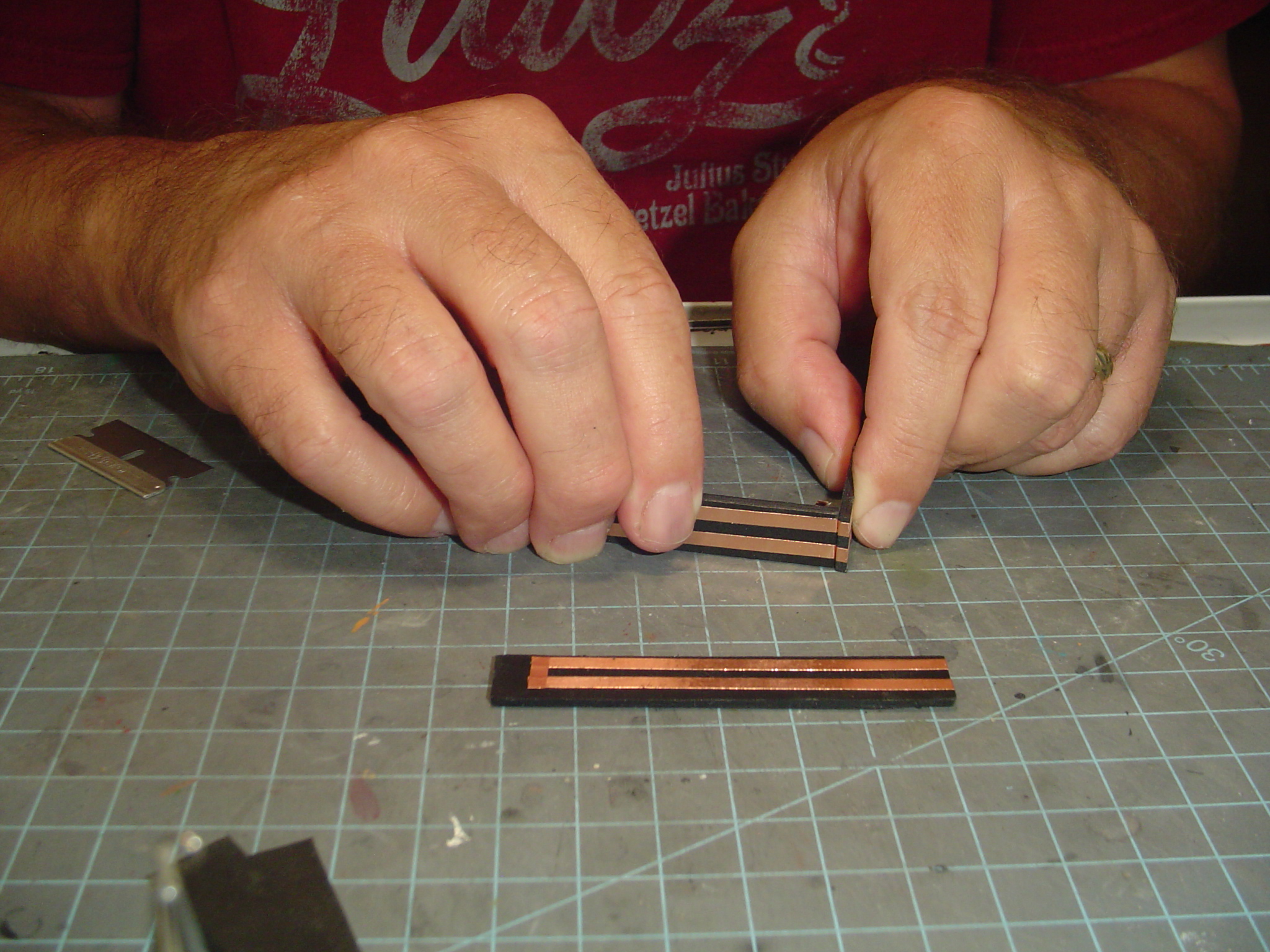 I make up my lighting circuits on the fly. Originally, I was thinking of one circuit with one Current Limiter and three LED's. Two LED's for the top floor and one for the bottom floor. But, the more I thought about laying out the copper tape, the more I realized that it would be easier to simply have two separate circuits. Each with one Current Limiter and two LED's. The copper tape was laid out the same for both. I also have a piece to attach these to that will act as a bus. the only trick here was to make sure the copper tape, at the end each circuit, lined up with the copper tape on the bus.