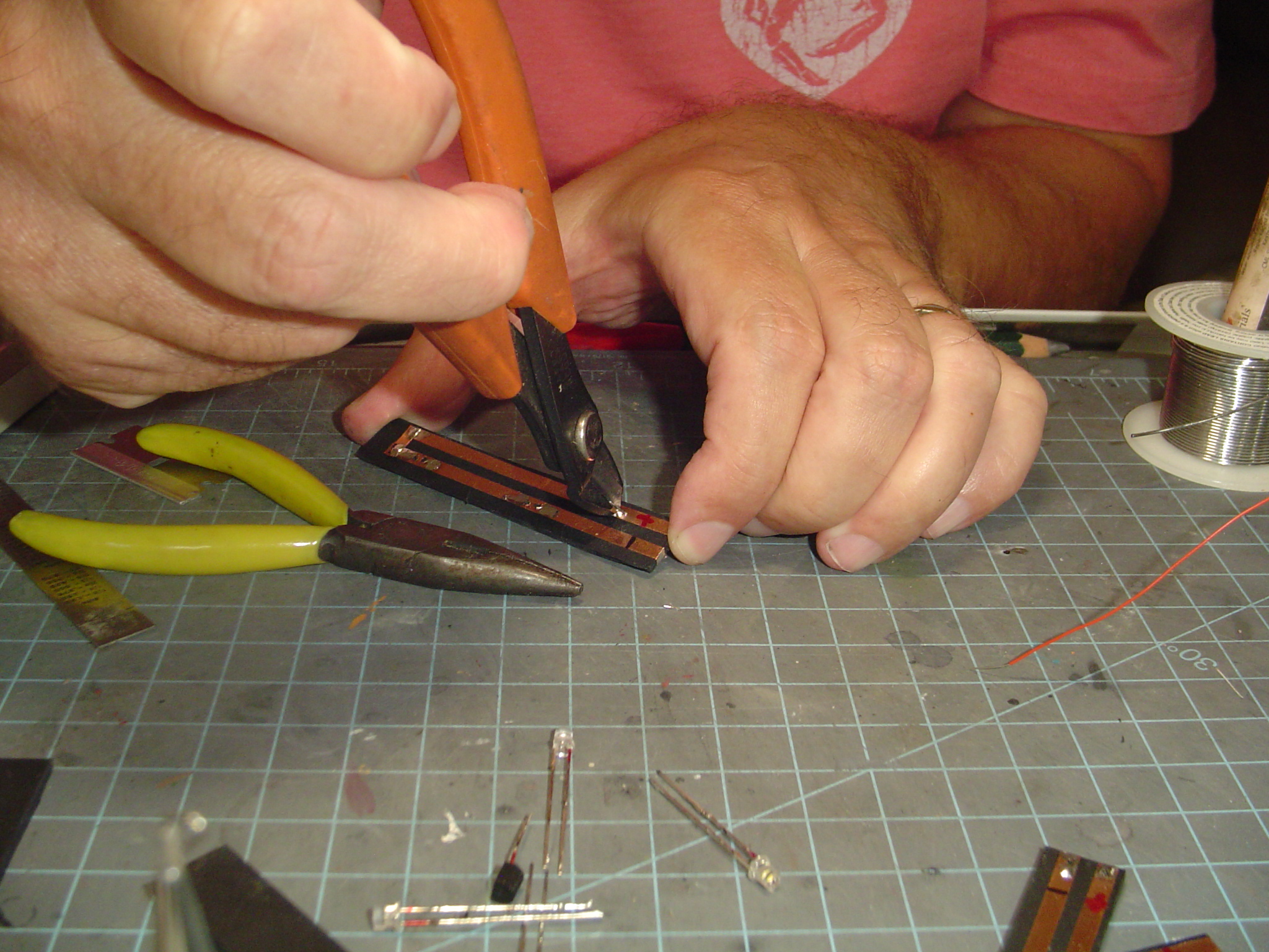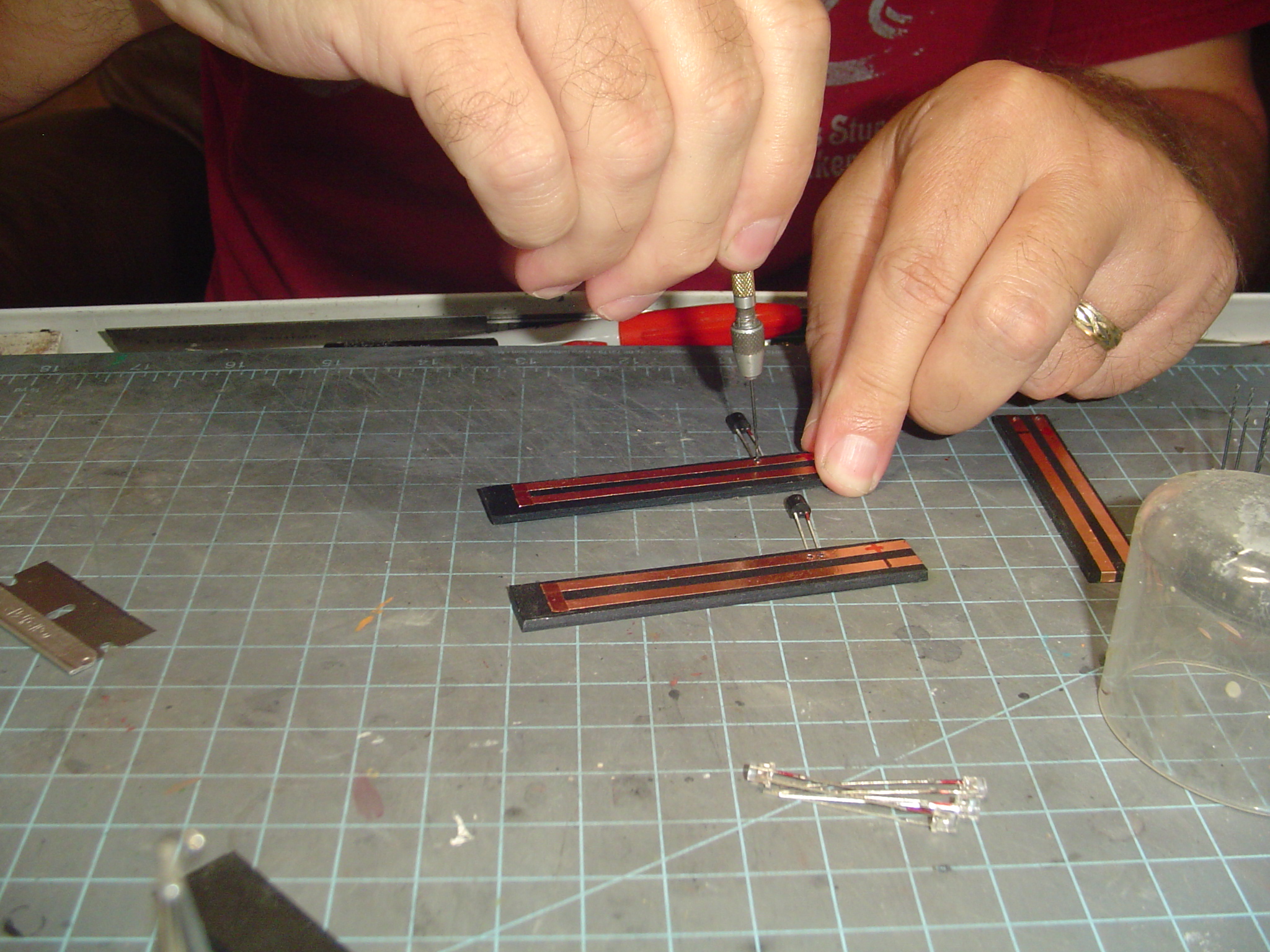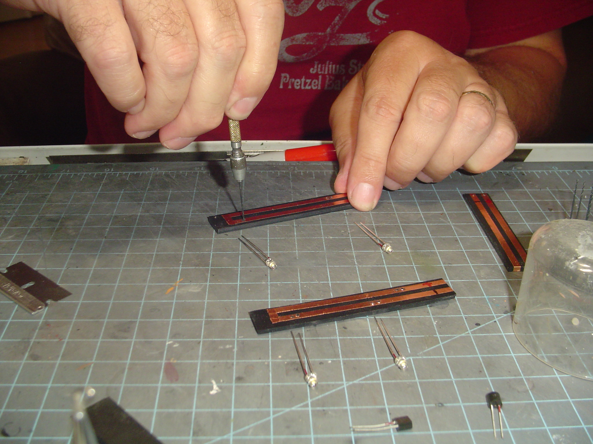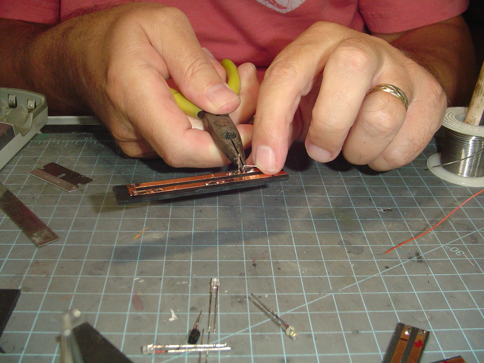 Here's a critical step. After they've been solder in place I remove the copper tape between the holes I drilled. If you fail to do this with the LED's they simply won't light up. If you fail to do this with the Current Limiter but not the LED's the LED's will light up, spectacularly, for a brief second and then never again. :o Ask me how I know.  ::)