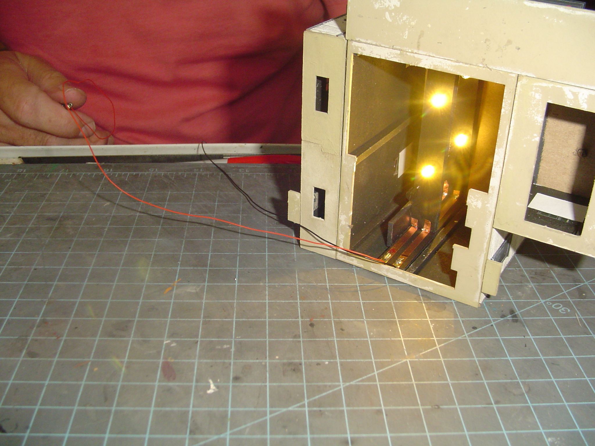 I soldered the two circuits to the bus, top floor and bottom floor, added a piece to the side to keep them square and then, using double sided foam tape, attached the entire thing to the back wall of the structure.