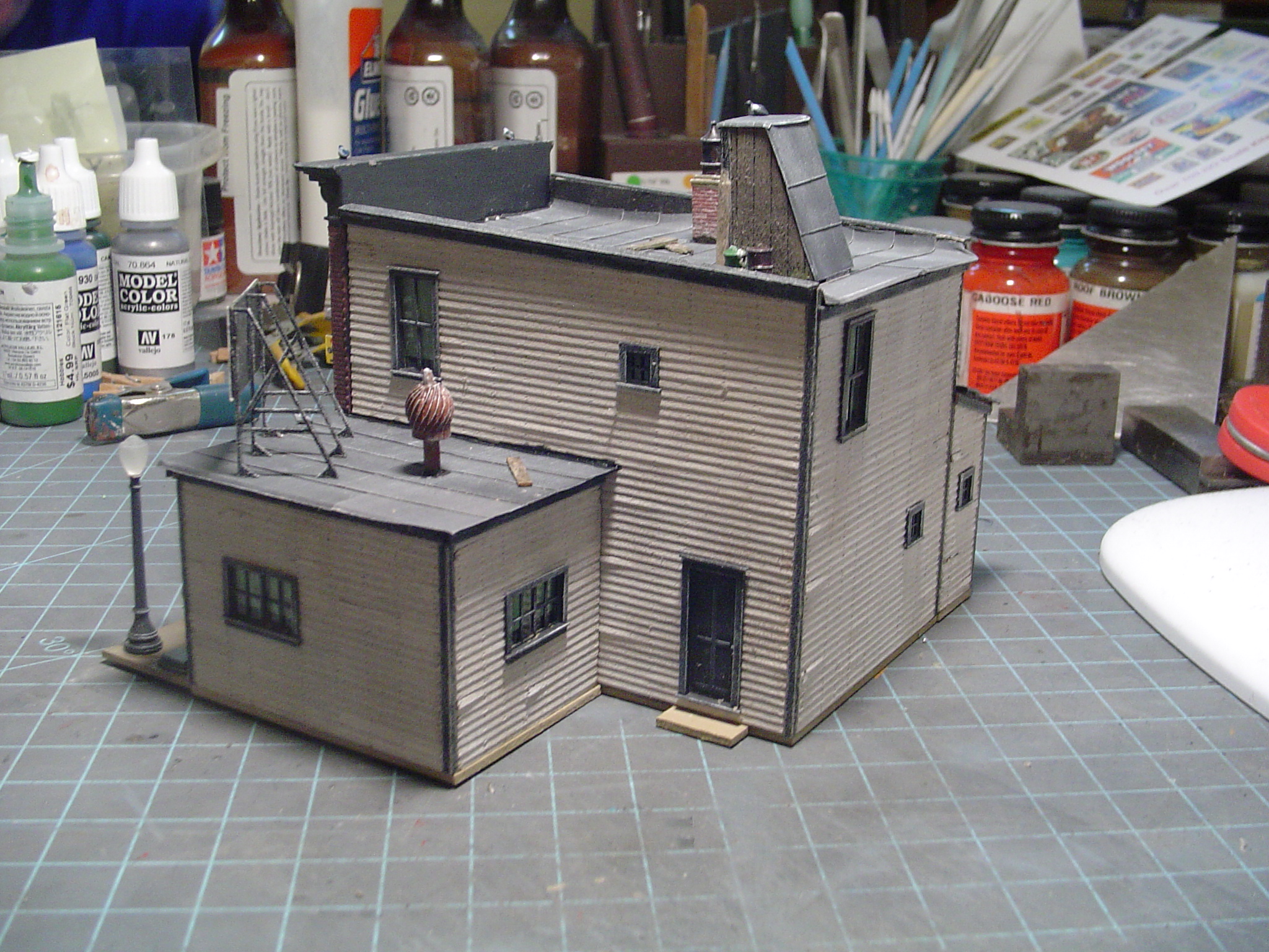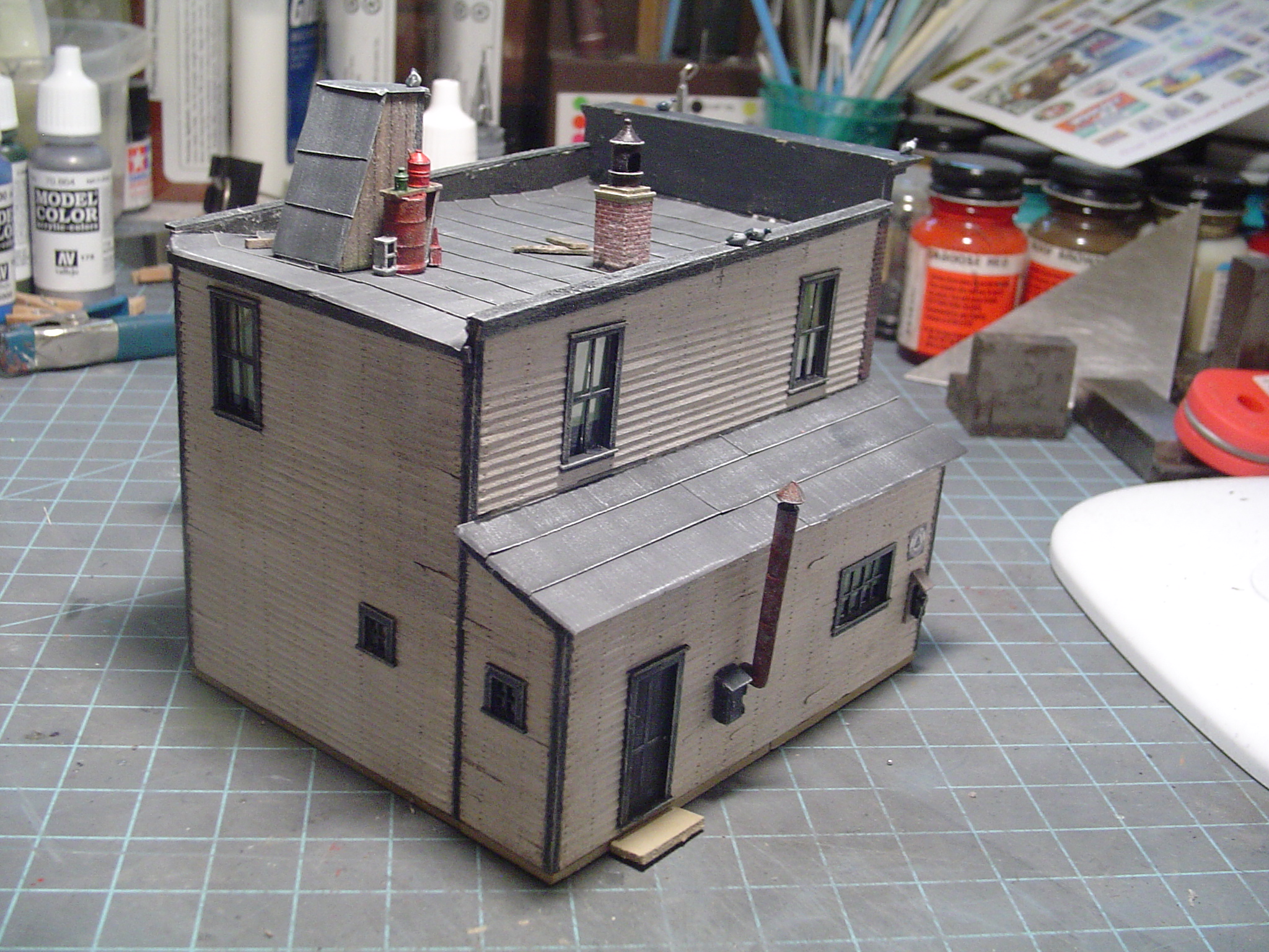 I hit the roof with a few different shades of Pan Pastel (mostly greys and browns) and then followed up dry brushing the roof with a craft store acrylic (Ivory White). It's easy to overdue the white so the brush has to have most of the paint removed and a very light touch is in order.