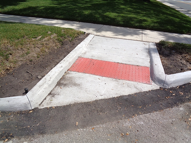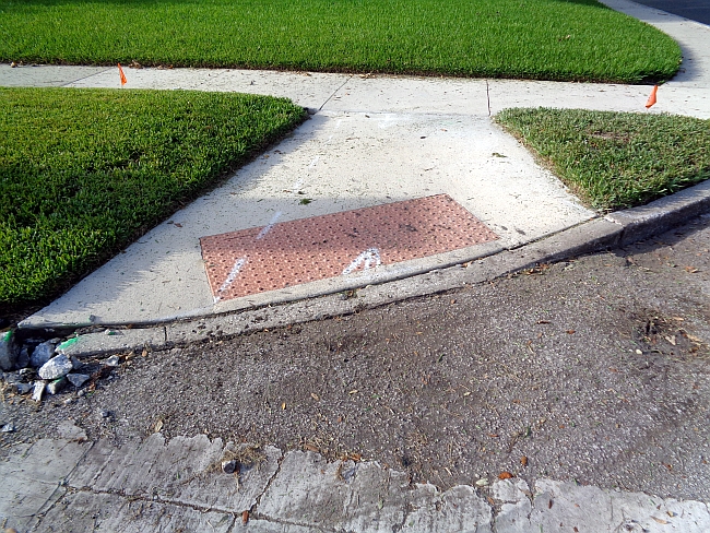 The next photo shows you the change they made. Now, if you fall, you will get hurt by breaking a leg or knee cap from the ADA ramps/curbs on each side. Then you fall in the grass.