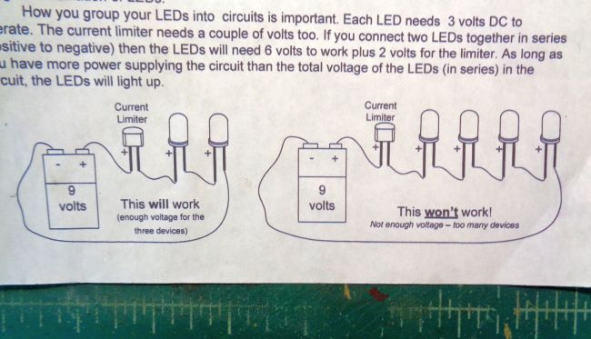 I can't find my MicroLumina Lighting Tips that talks about how to use MicroLumina current limiters.  Does anyone have a quick tutorial on those?  I do remember that each LED takes 3v and the current limiter takes something like 2v, so you can light three 3v LED in a circuit with a current limiter and 12v input.  But I don't quite remember how those are wired, the 3 LEDs in series with the current limiter?  Or is the current limiter in parallel?   And if you have to align the current limiter a certain way, which pin gets + vs -?
