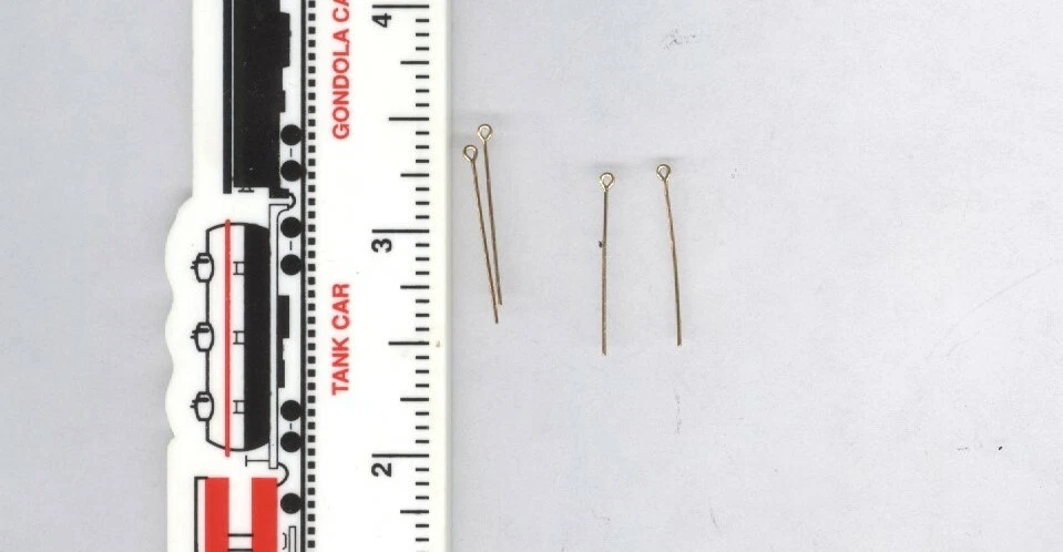 I snipped the end off one of the small watch parts that had a pre-drilled hole in the end. I used AK Metal Burnishing fluid to blacken it. I cut the ends off two tiny brass eye pins. I cut an 18 inch (in HO scale) section of round, wooden dowel rod and drilled both ends with a 70 (.0280) drill bit. I then superglued the two hooks into the dowel, one on each end.  Fourth picture.