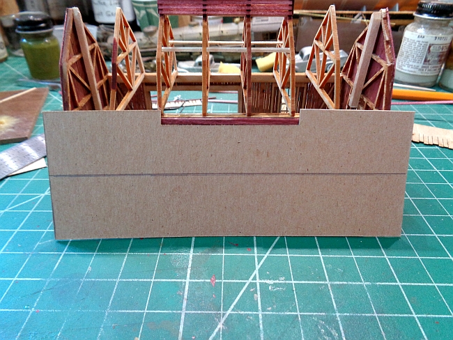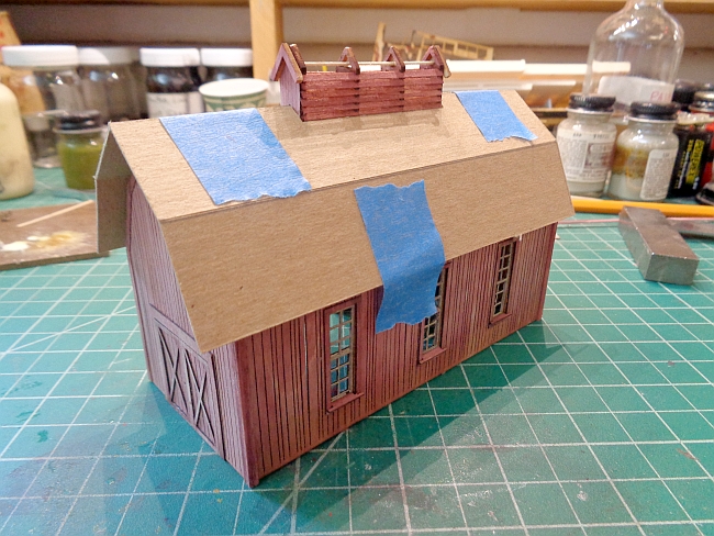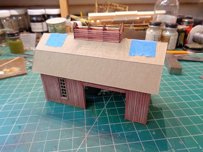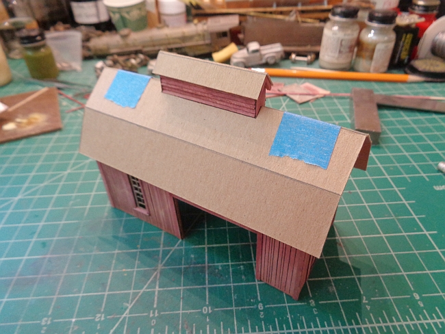 Prior to gluing the roof panels on the barn, I added the 3M transfer tape. I then glued the roof paneling on the barn trusses and on the clerestory.