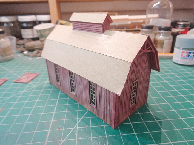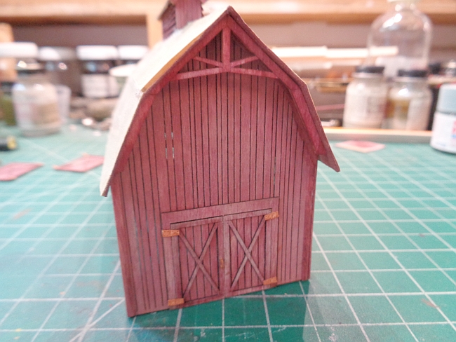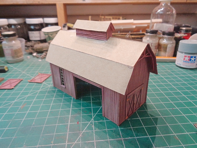 When I found the pictures of the barn build by James Lucas, I should have searched it further. I saw that the roof he made was peaked and thought he re-constructed it that way from a gable roof, as part of his kit-bash. I have seen the kit before like the one Steve Custer constructed, but had forgotten about it.