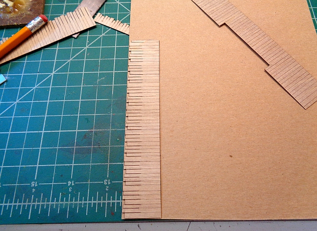 The roofing panels in the kit are the same 1/64" thick material as the other parts. Also, each roof side is made up of two separate panels. I decided to make my own panels from cardboard and have each side as one piece.