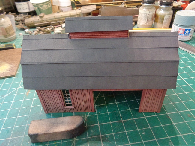 I used two different colors of black. The one in the kit wasn't enough to cover the roof. Since this is a barn, I didn't want to use fancy roofing material, which I have plenty of.
