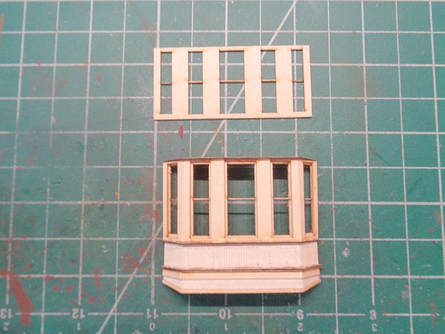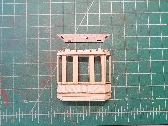This afternoon I started assembly of the turret. I thought the bay windows were a challenge until I started the turret.