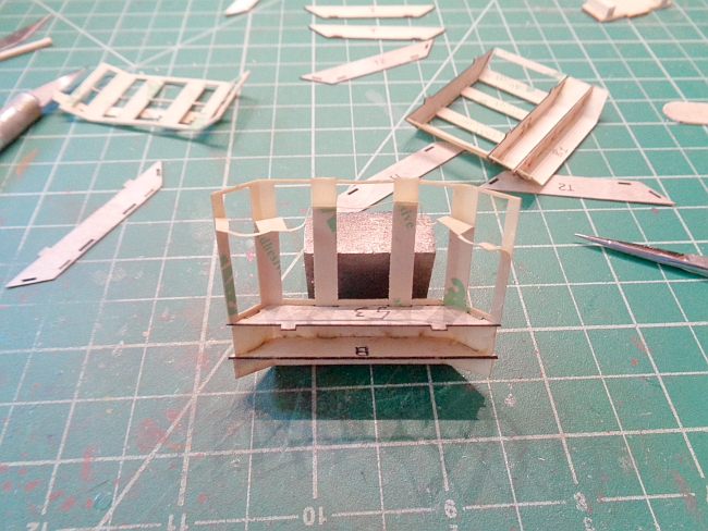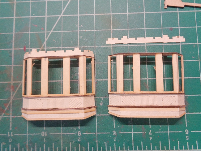 I took me most of 90 minutes to carefully cut, hold with tweezers and glue the corbels in the slots.