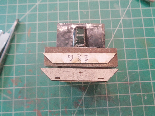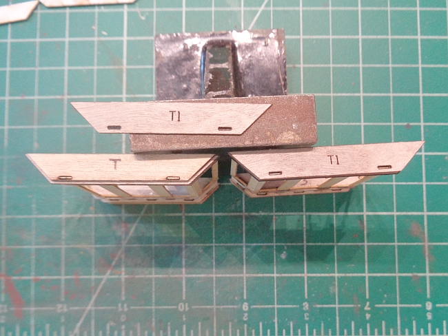 I then glued part 116 in place on top of T1. It is to be centered and flush with the rear of the other parts.