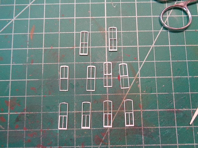 I started to assemble the windows. The next photo shows the six round top windows. The two on top of complete as far as the interior frames. The ones on the bottom need to be glued together to look like the top two.