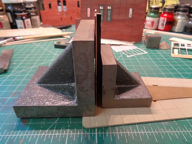 I started by gluing the wider end wall to the base.  I noticed the base was slightly warped with a hump in the middle. I glued the end wall to the base, made sure it was perpendicular to the base and secured with with heavy weights to make sure it glued flat.