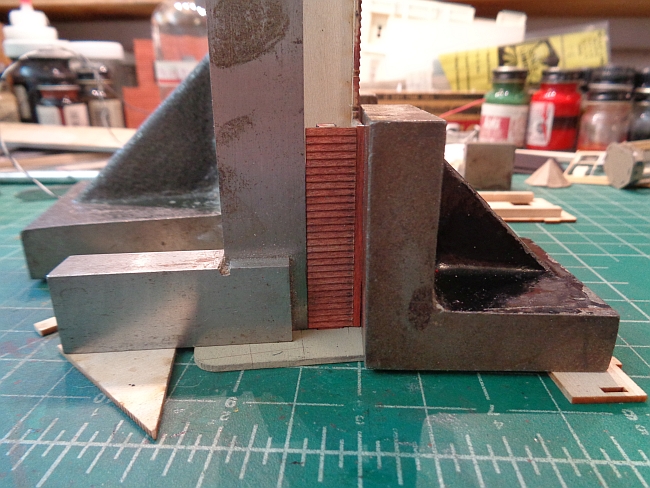 I then glued the rear wall section in place. As you can see in the following photos, I made sure the walls were perpendicular and flat on the base.