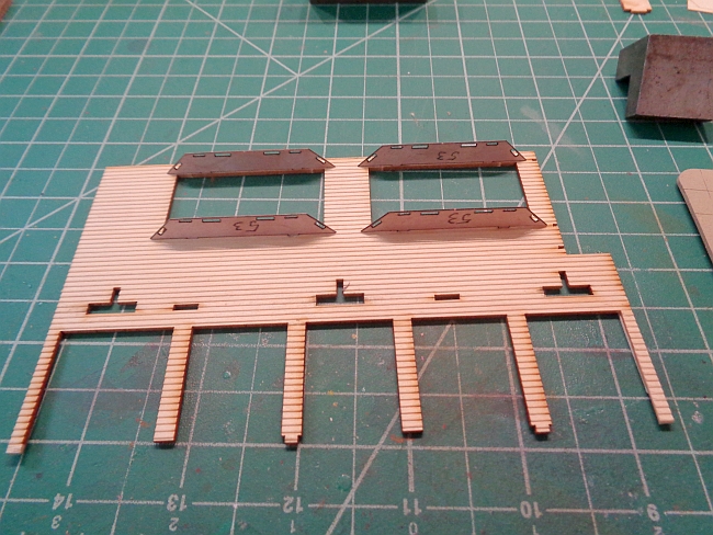All four of the parts, #53, were also test fitted in the slots. These are the only parts of the two bay window that have tabs that fit into the front wall. These fit nicely with no adjustments necessary.