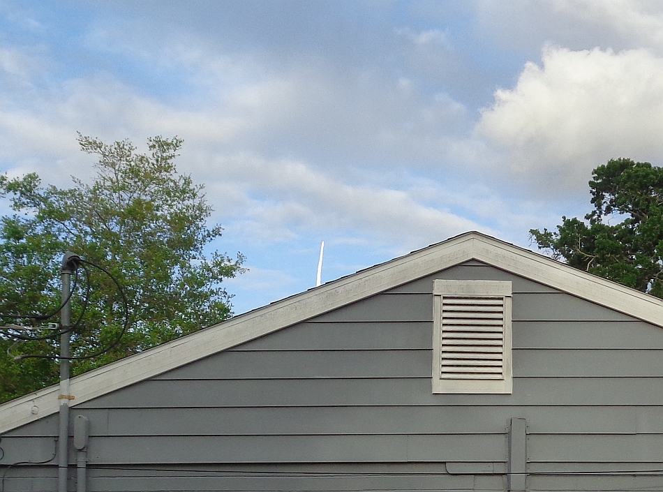I live about 53 miles due east of the Kennedy Launch Site. Due to the cloud cover between here and there along with the distance, this is the best picture of the launch I could get. Looking over the neighbor's roof.