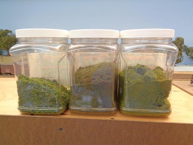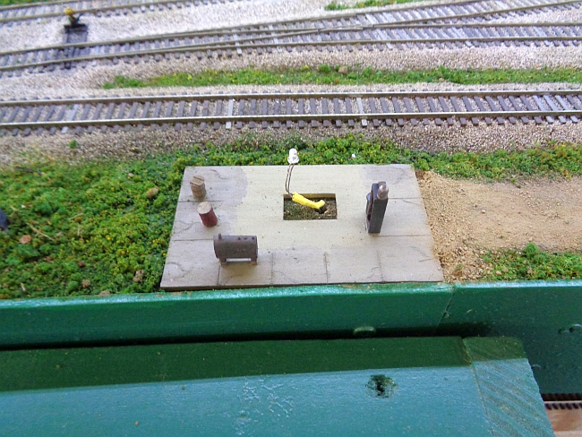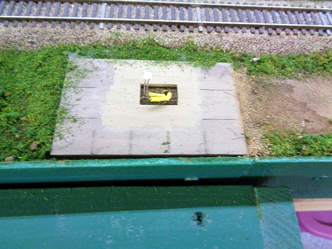 Once the concrete base was secure, I added some scenery material. White glue was "painted" on the layout around the base. Three different Scenic Express and Woodland Scenic material was spread over the while glue.