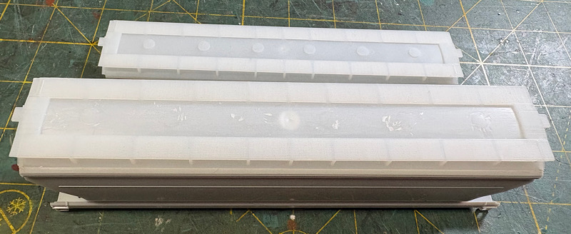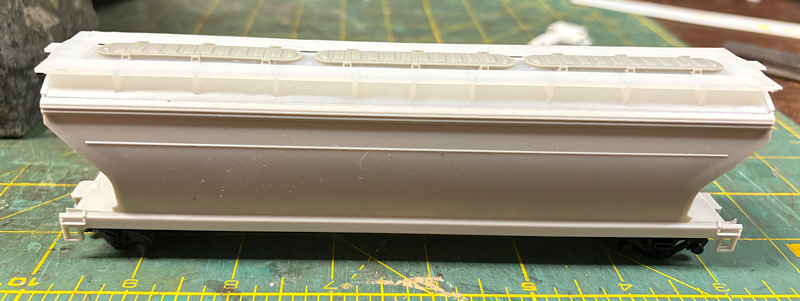 The roof hatches are Atlas parts that I ordered a year ago because despite the box saying this is a grain car, the kit only included round hatches, rather than the trough hatches typical of grain cars.  I had to carefully remove some short pins on the roof of the McKean car, as well as remove pins on the Atlas parts.