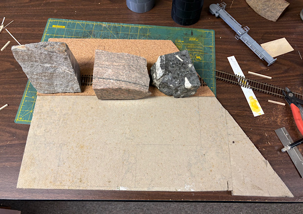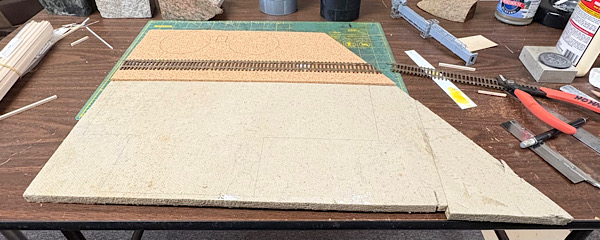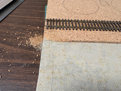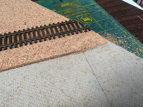 In the photo you can see where I glued down a sheet of 1/8"cork to provide a little relief. The metamorphic rock bookends guarantee the cork edge is flat.  The result with a section of code 70 track:
