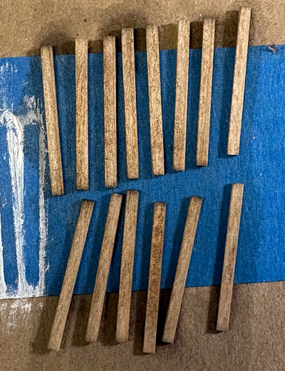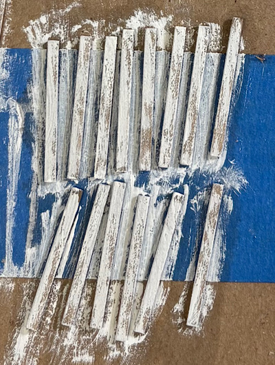 My first attempt did not go well.  I stained the stripwood, cut them out, glued them side by side, and drybrushed the white.  I could not see the individual boards.  My solution was to cut the boards first, sand the edges to round them off a little (not too much), paint each, and them assemble into a door.