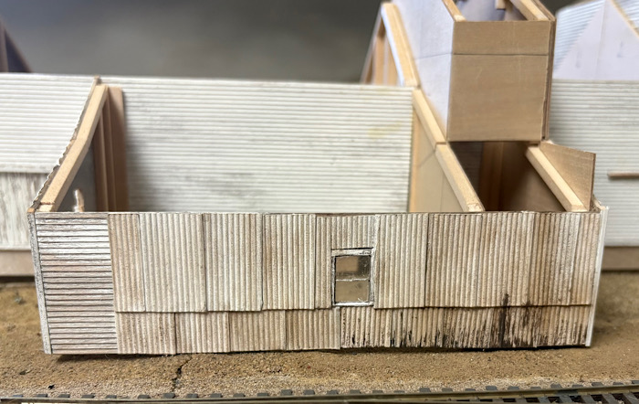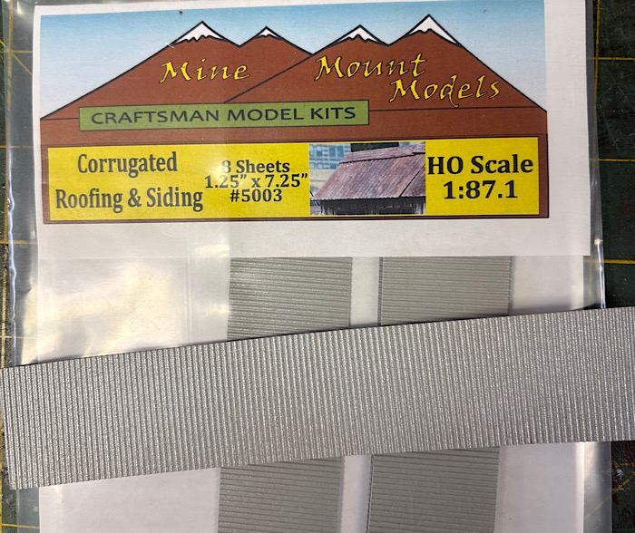 I decided to use "corrugated iron" material from Mine Mount, a paper product I find superior to actual metal.  It comes in long strips, already in a galvanized iron finish, although I will be painting it.