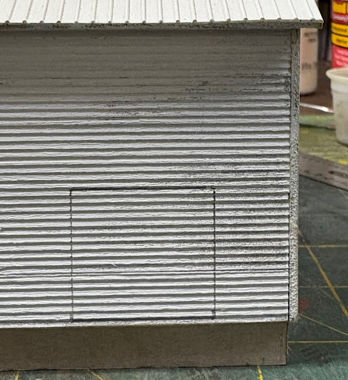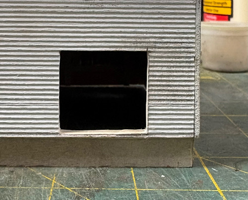 Cutting the opening required many passes with the Xacto knife while holding the building on my legs, knees apart, opposite-side down.  I was very grateful for my habit of robust construction.