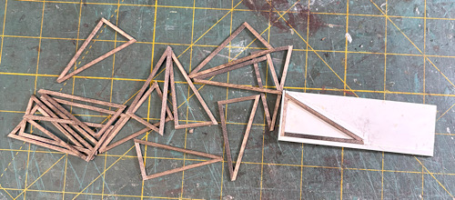 I didn't plan to make any roofs removable, especially with the interior almost invisible with the few windows and solid doors.  However, I used all those triangular scraps of sheetwood that you get when cutting out gables to provide additional bracing to some of the walls. Other pieces I used as jigs in my chopper to cut bracing at appropriate angles.  I have remarkably few scraps left over.