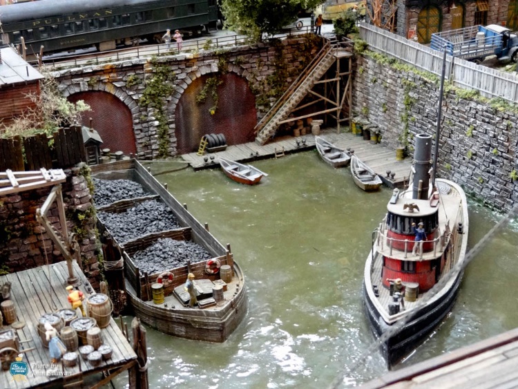 As we pass the HookLine & Sinker Seafood Company we come to this bay with a coal barge and a tug ready for duty.  John Sullivan captured this photograph of the area.