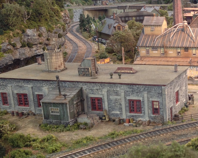 Here are a few more pictures of the CC Crow Engine House kit bash called The Adams & Westlake MFG. Co.  The mystery of the name of this structure was solved by a blowup of a picture I took from the other side of the layout. Updated post 04/21/15.