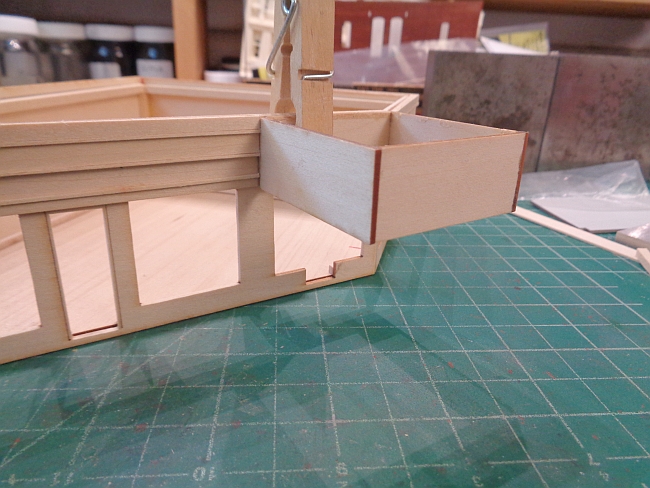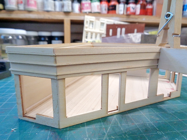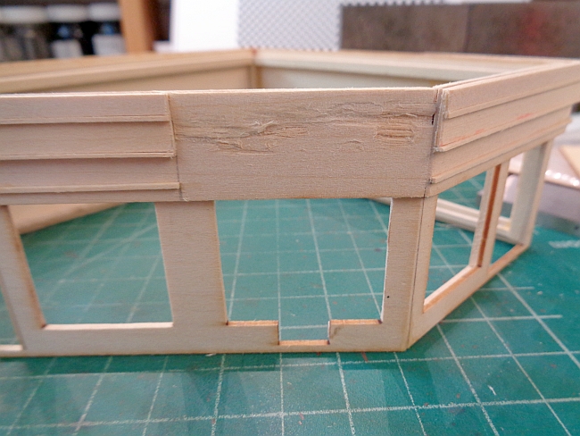 I was adding the upper detail trim to the service station. I got so engrossed in the trim that I forgot that a portion across the front was to be left off. This was to allow the canopy roof to be added.