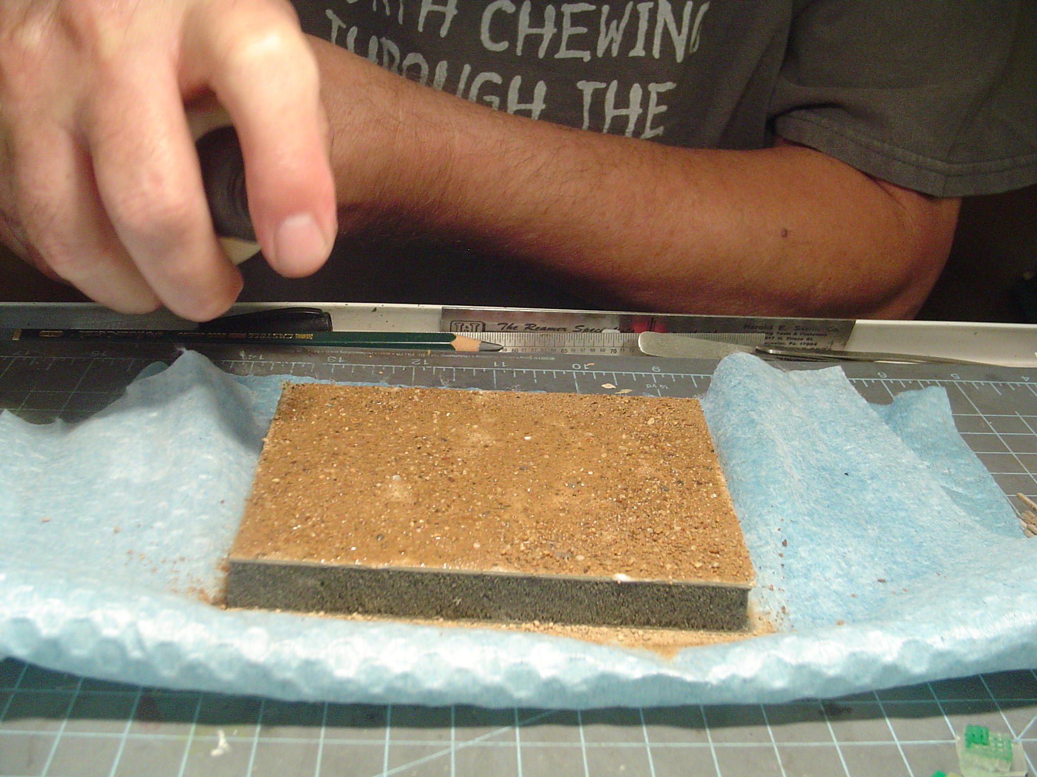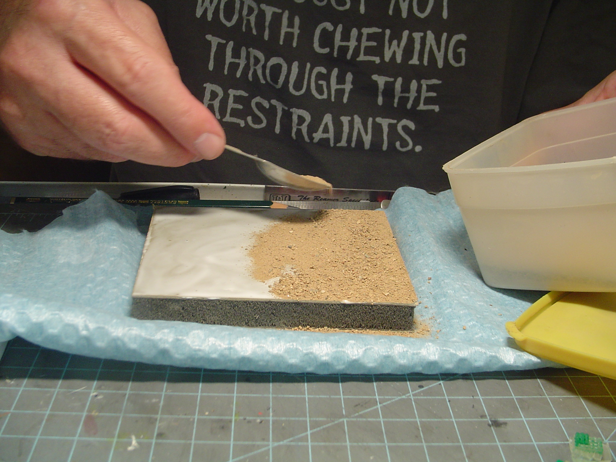 My really basic scenery starts by applying some Elmers White Glue to the surface.
