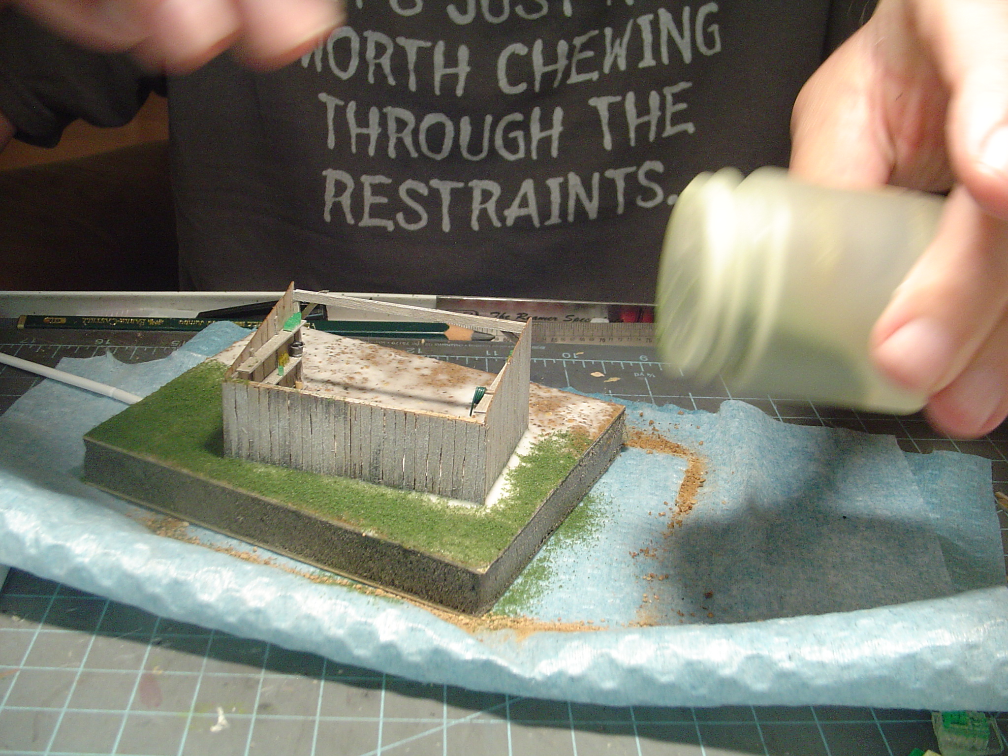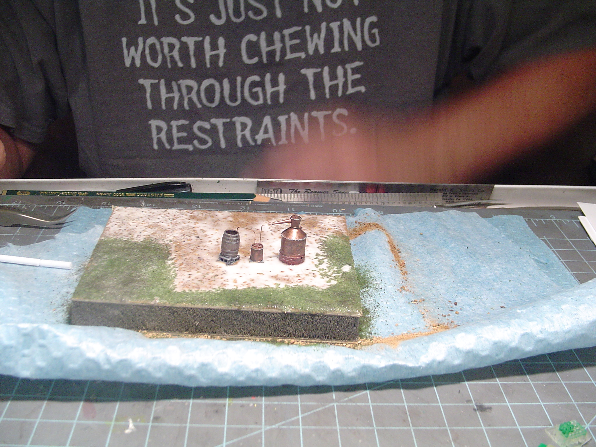 Finally, at least for today, I start positioning some of the details that go inside the shed, like the still, and got them settled down into the dirt. They'll be glued in place when everything dries.